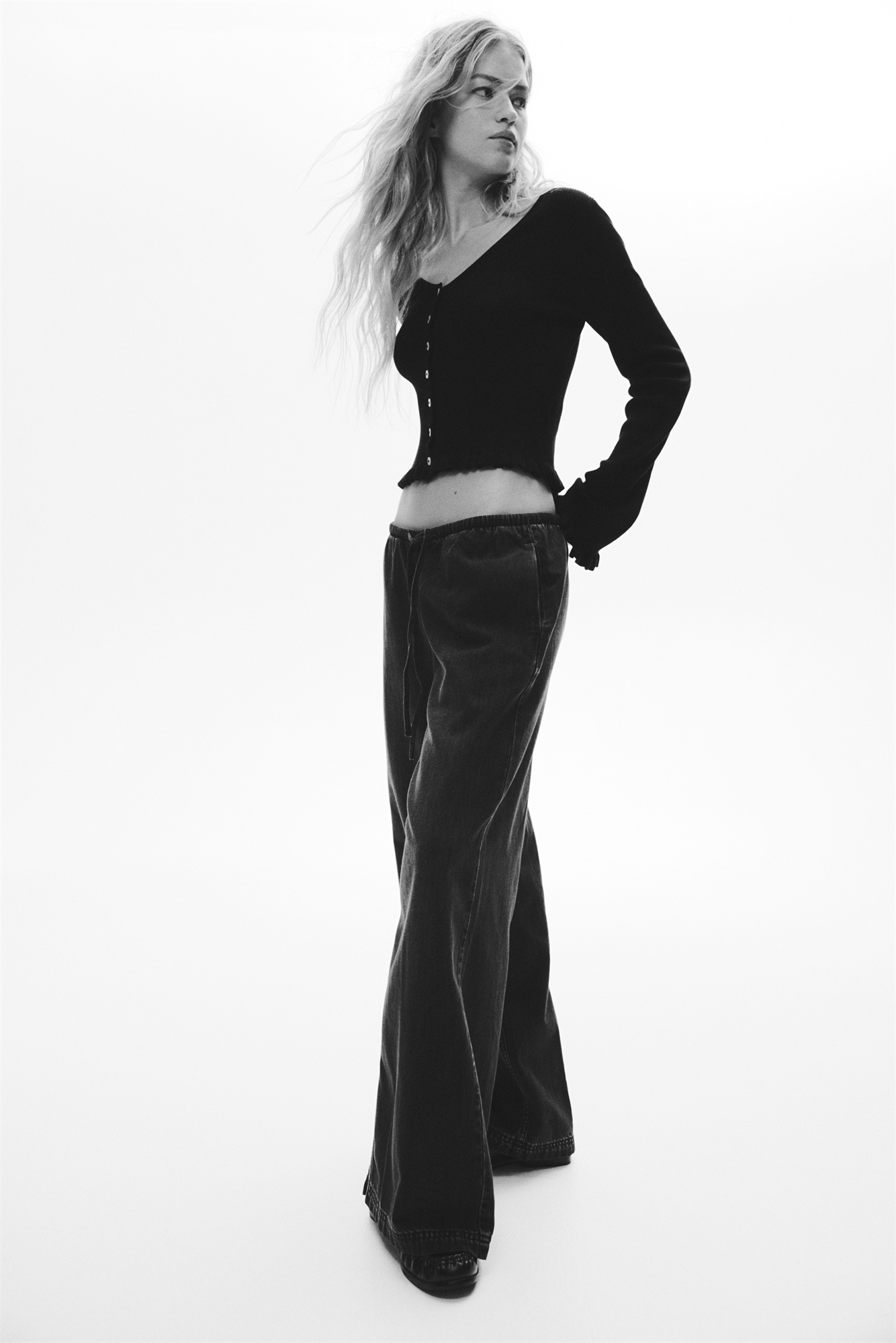 Свободные брюки из супермягкого и легкого денима из смеси лиоцелла и хлопка. Эластичная отделка и эластичный шнурок на талии. Небрежные боковые карманы, открытый задний карман и широкие штанины.