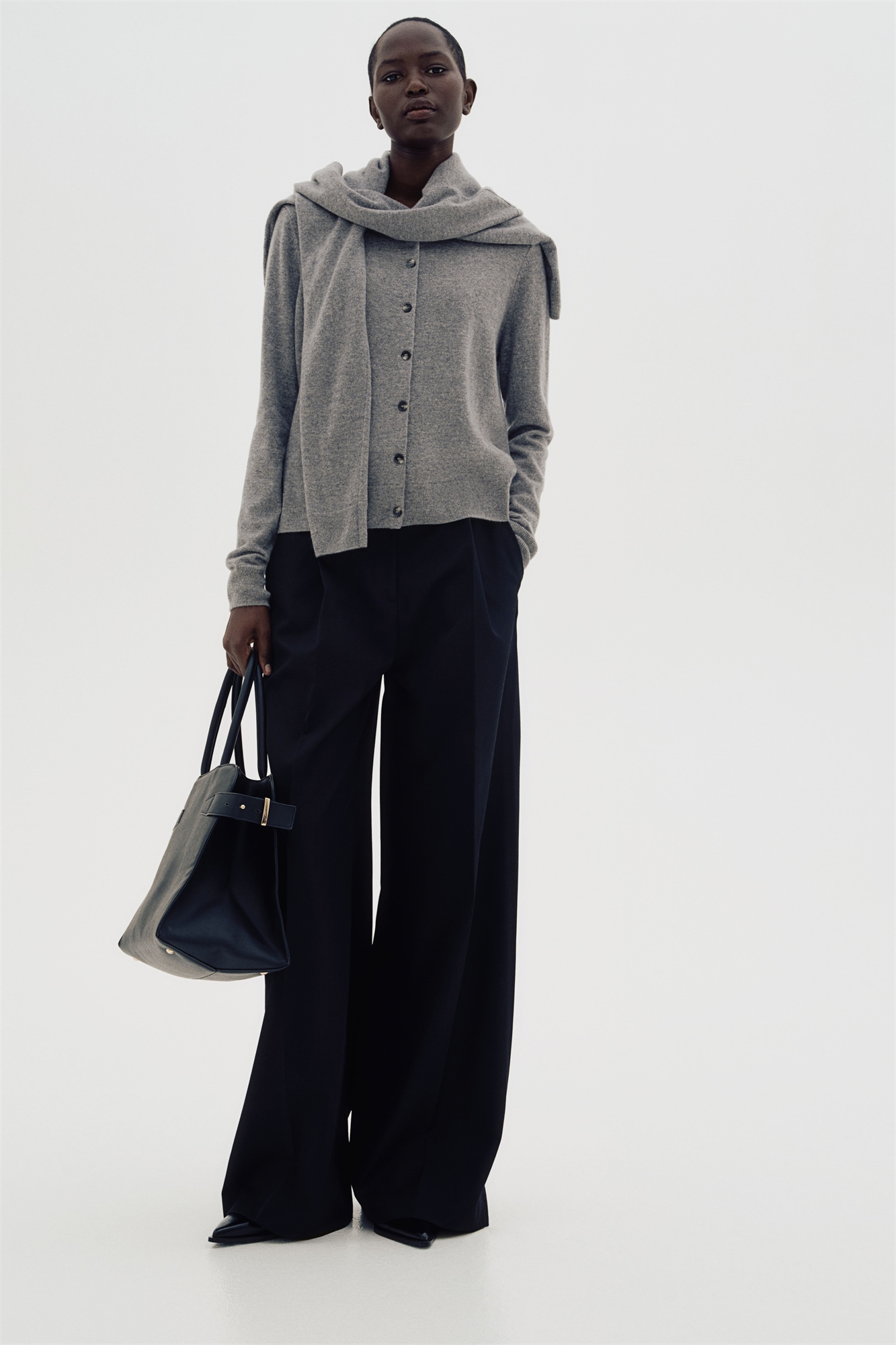 Свободный кардиган из мягкого кашемира тонкой вязки с круглым вырезом, отделанным ребрами, и пуговицами спереди. Манжеты и подол отделаны ребрами жесткости.
