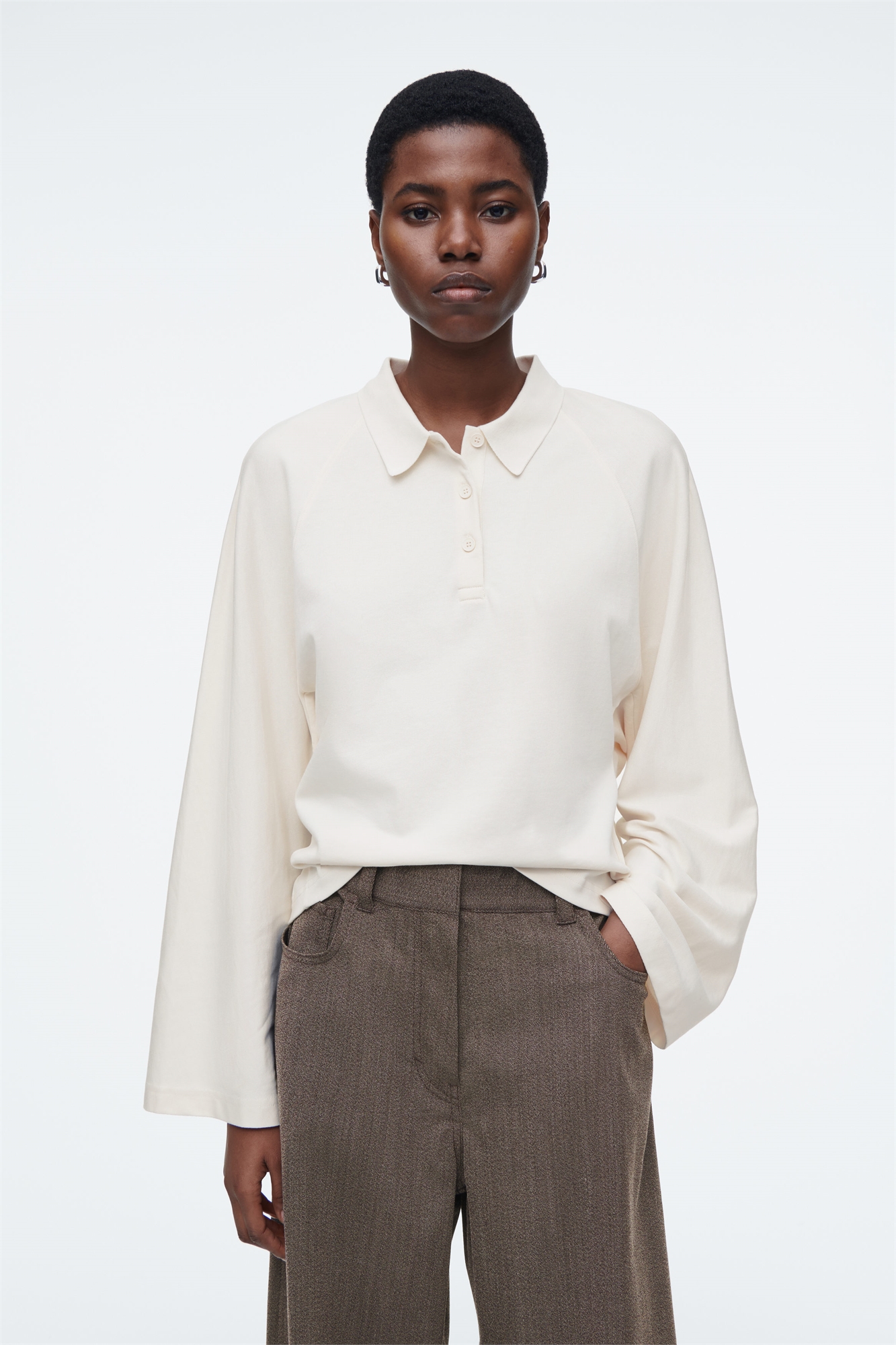 Этот свободный топ - изысканный вариант классической рубашки-поло. Он выполнен в мягком цвете экрю из смеси хлопка и имеет заостренный воротник, тональные пуговицы и длинные рукава. Свободный крой Застежка на пуговицы Материал: 70% хлопок, 30% вискоза. Воротник: 100% хлопок. Без учета отделки / Машинная стирка Длина по спинке для размера S составляет 56,5 см / Модель носит размер S