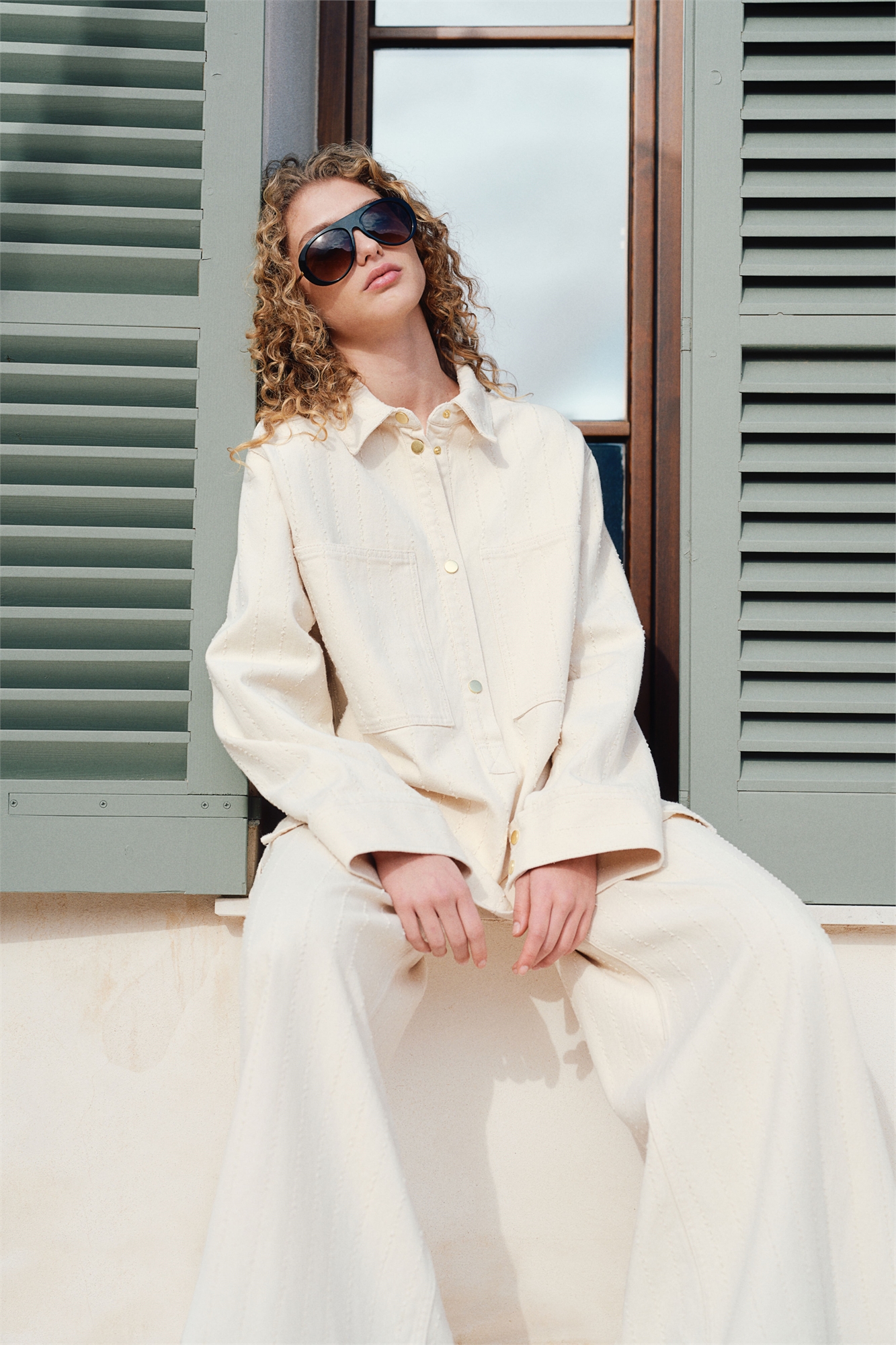 Рубашка-поповер из хлопкового денима с едва заметным рельефным рисунком в полоску, создающим текстурный эффект "тон в тон". Свободный крой с воротником, застежкой на пуговицы и большими нагрудными карманами. Длинные рукава с манжетами на манжетах. Подол прямого кроя с разрезом с каждой стороны.