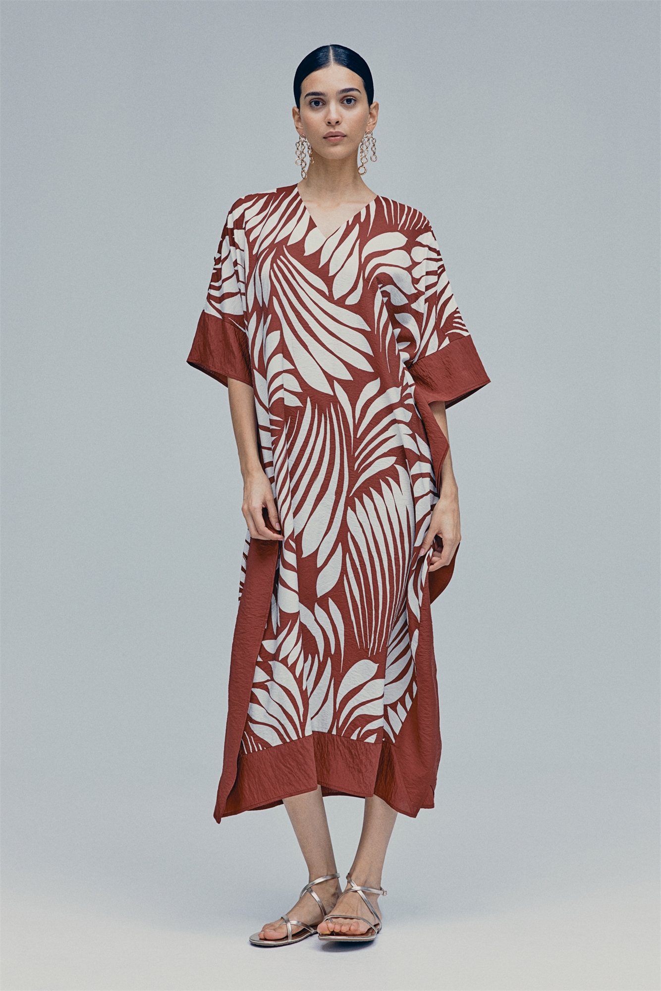 Длинное платье-кафтан свободного покроя из крепового атласа с принтом на всю длину и однотонными каймами. V-образный вырез и рукава 3/4. Без подкладки.