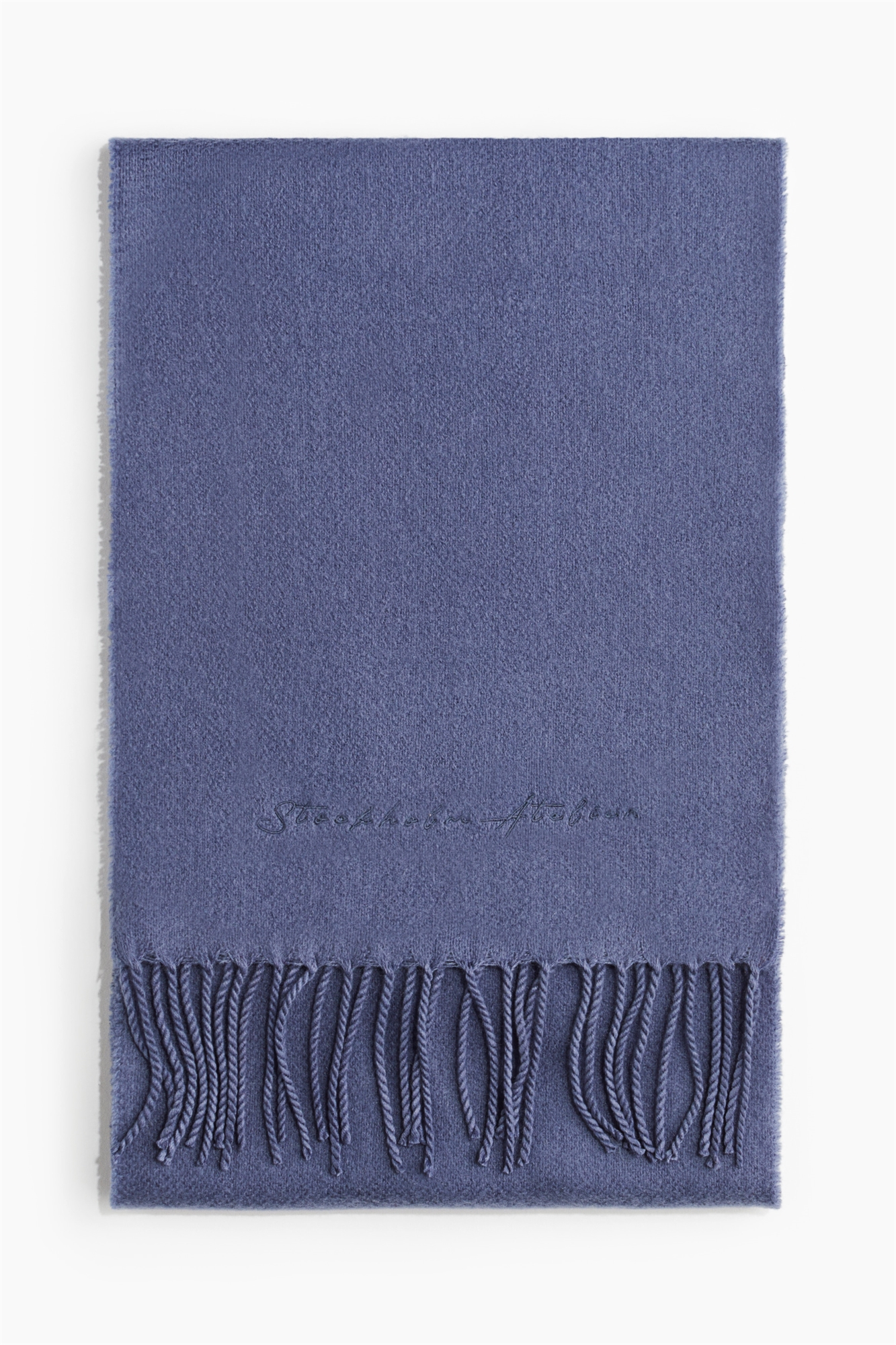 Шарф мягкого плетения с матовой отделкой и палубными краями. Вышивка с текстом тон в тон с одной стороны и крученая бахрома по коротким сторонам.