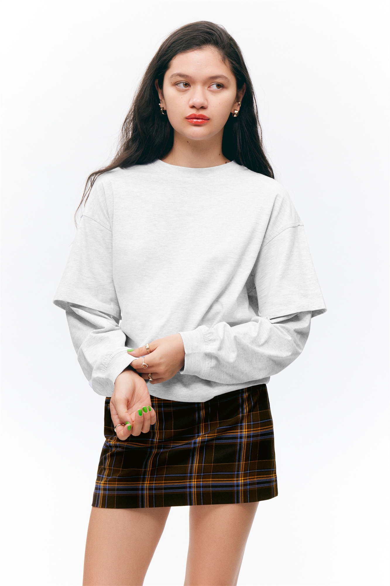 Двухслойная футболка из джерси с длинными рукавами, крой оверсайз. Она имеет круглый вырез и прямой подол. Свободный крой. Обычная длина. Круглый вырез. С длинными рукавами. Двухслойная.