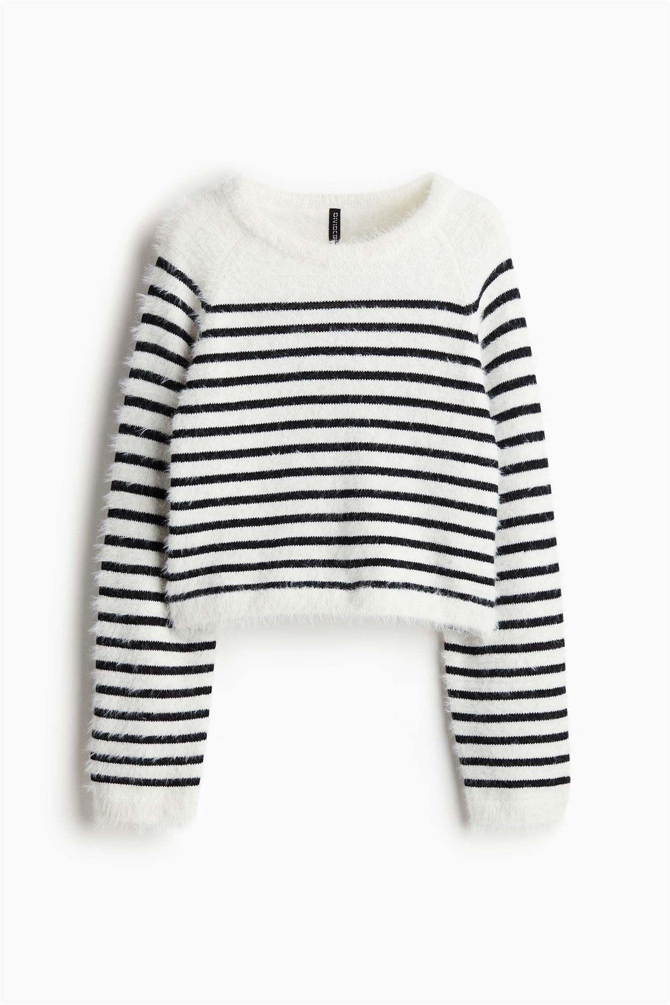 Джемпер из мягкого пушистого трикотажа с круглым вырезом в рубчик и длинными рукавами реглан. Ребристые манжеты и подол.