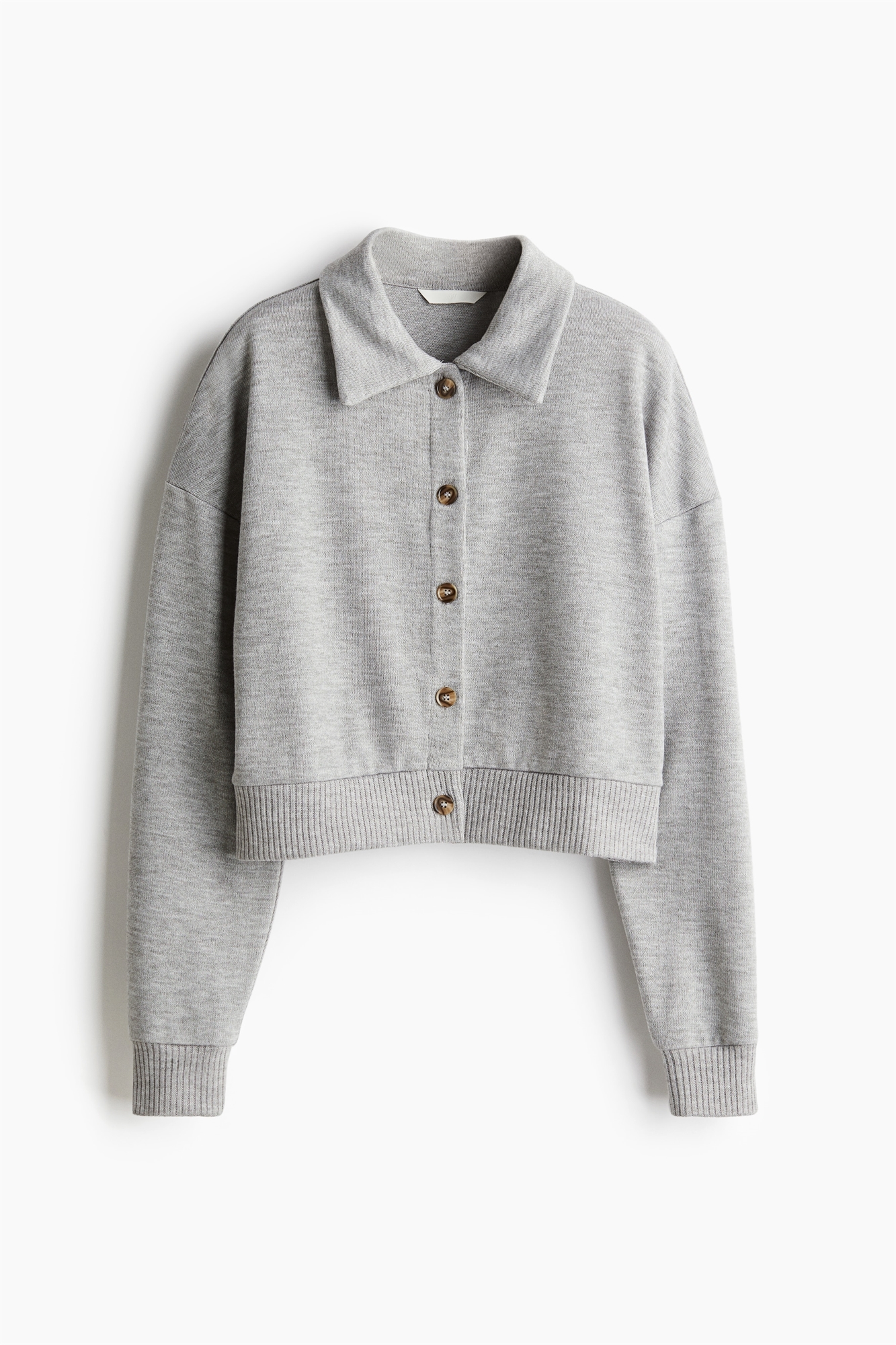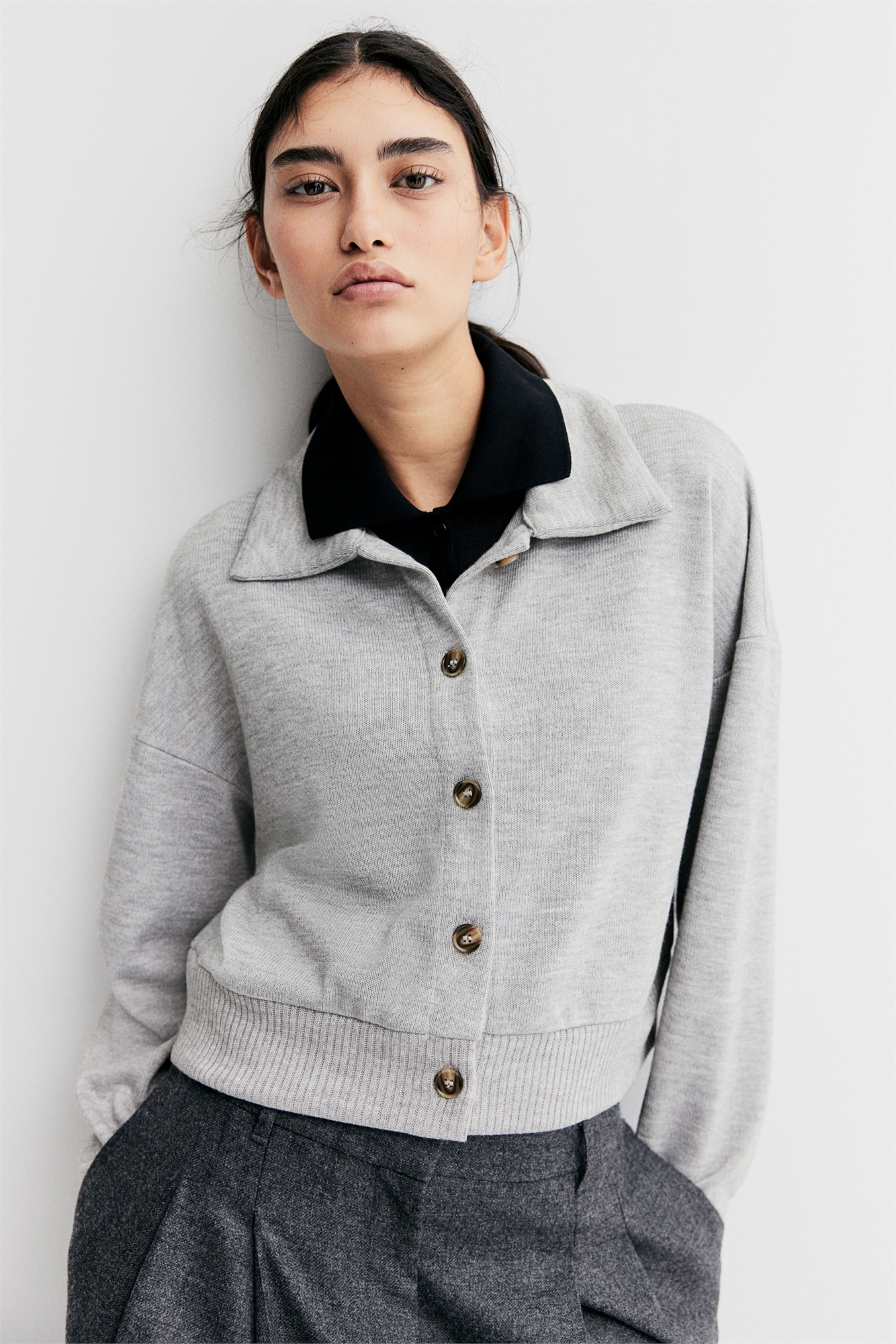 Кардиган из мягкого тонкого трикотажа с воротником и пуговицами спереди. Свободный крой с опущенными плечами, длинными рукавами и ребристой отделкой на манжетах и подоле.