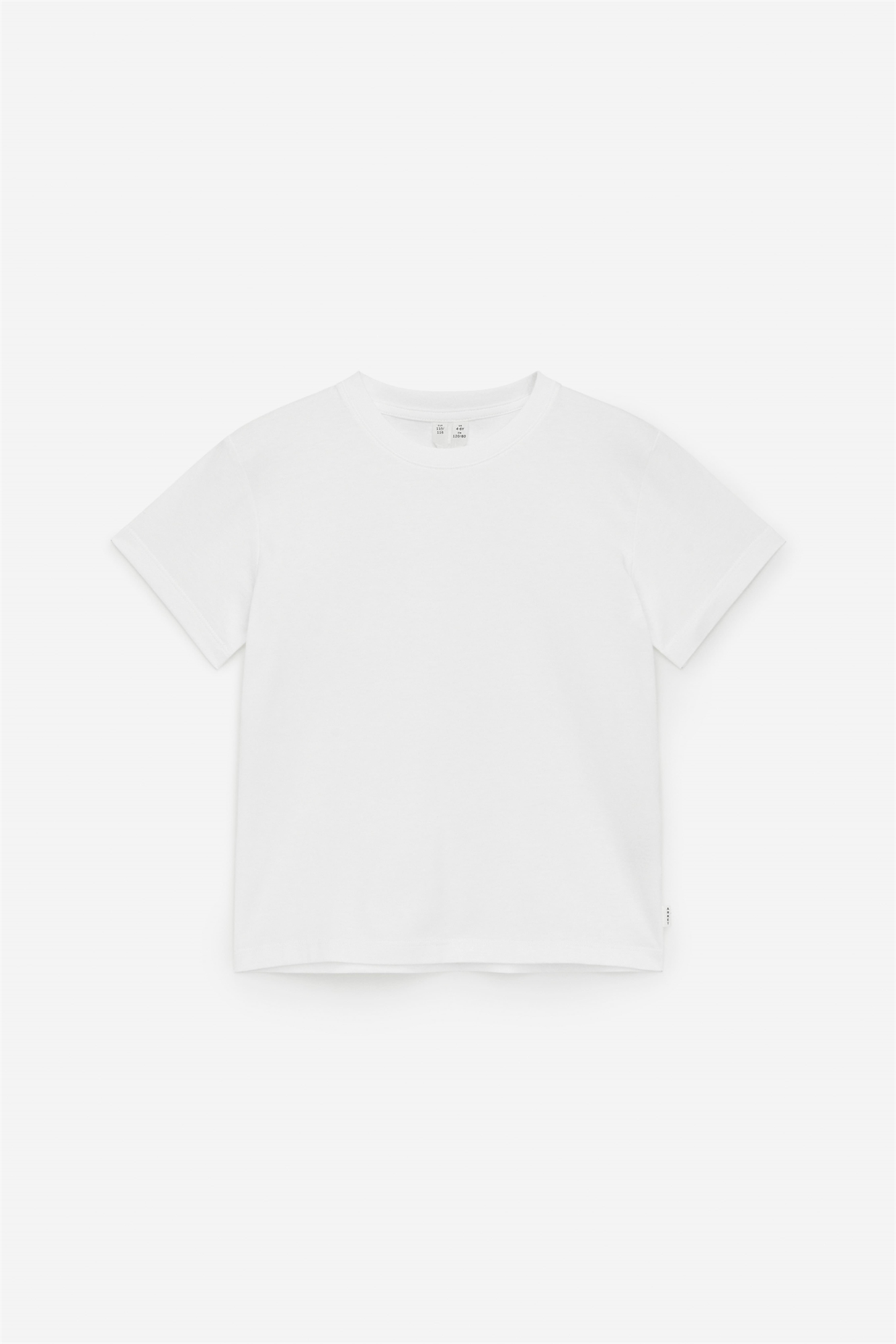 Футболка из хлопкового джерси средней плотности. Модель с вырезом для экипажа и обычным кроем.
