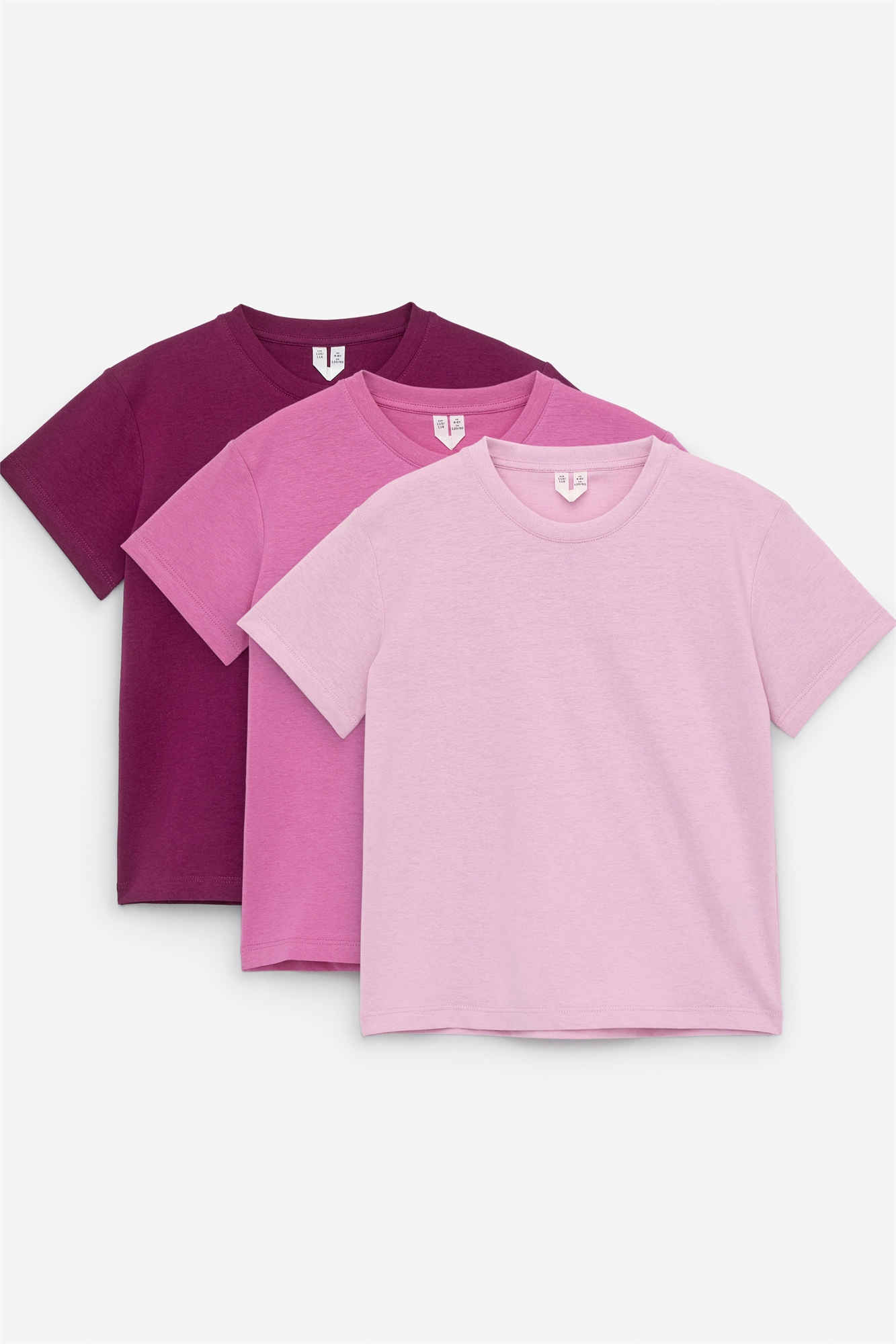 Футболка с круглым вырезом из хлопкового джерси средней плотности. Она имеет обычный крой и горловину. Продается в практичном наборе из трех штук.