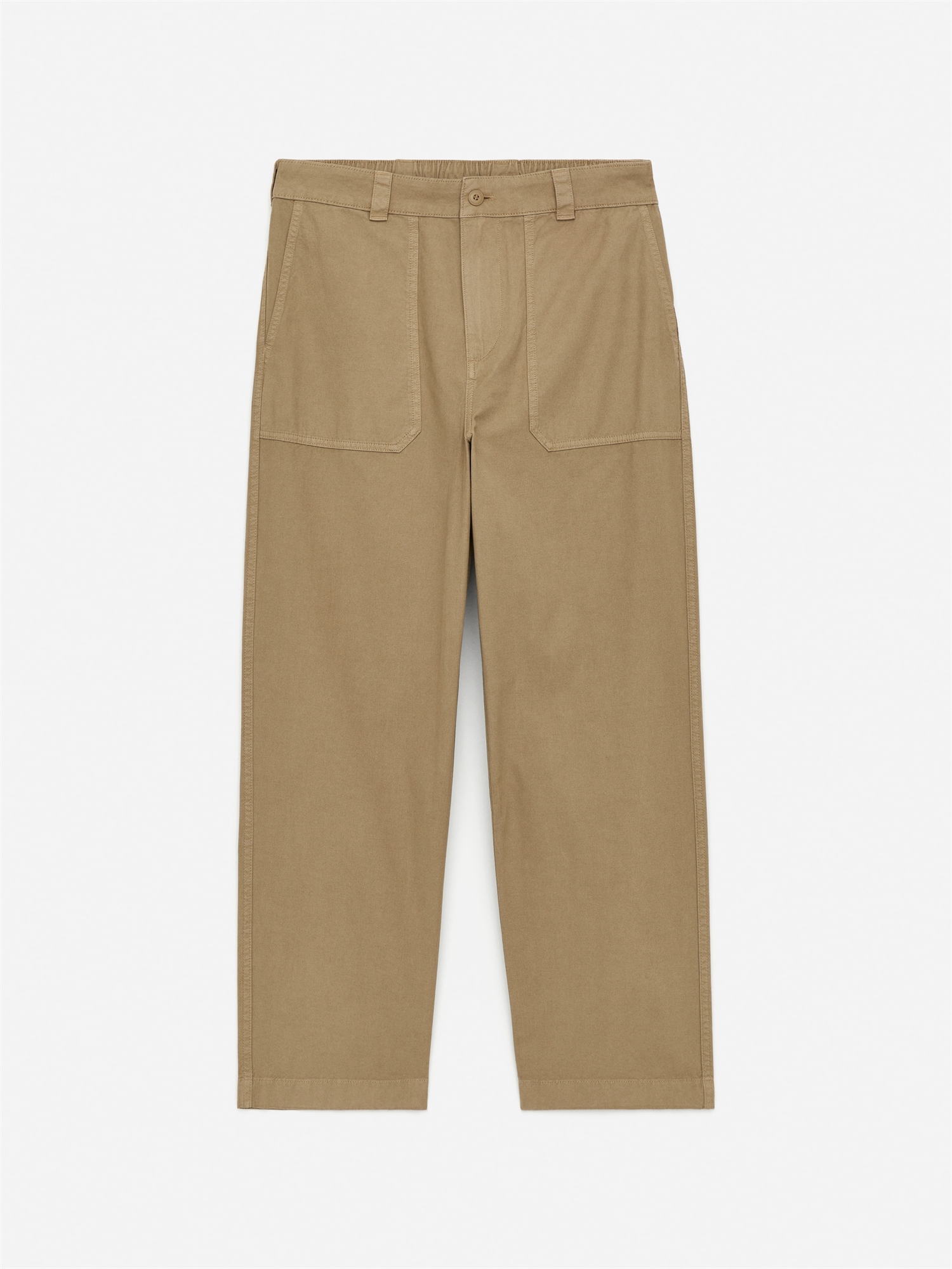 Хлопковые брюки в стиле утилитаризма. Модель с прямыми ногами, двумя большими карманами спереди и двумя накладными карманами сзади. Пояс на талии с резинкой и петлями для ремня. Застежка на пуговицы и ширинка на молнии.