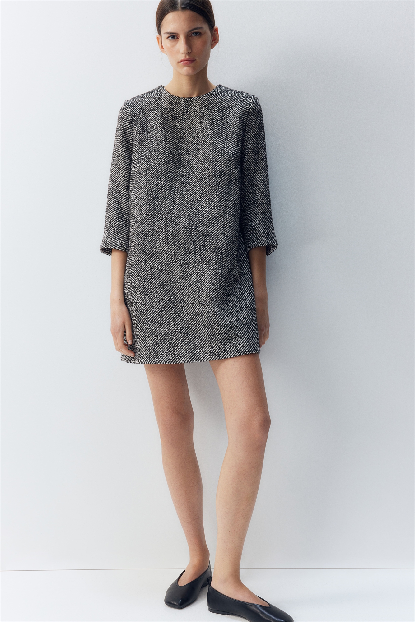 Короткое платье А-силуэта из буклированной ткани с круглым вырезом и рукавами длиной 3/4. Нагрудные вытачки и потайная застежка на молнию и пуговицу сзади. На подкладке.