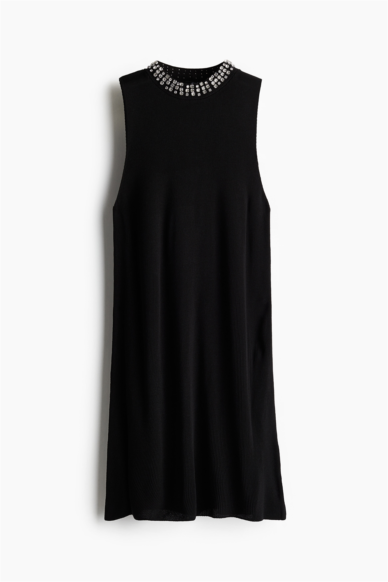 Короткое платье без рукавов из мягкого трикотажа со стразами по вырезу горловины.
