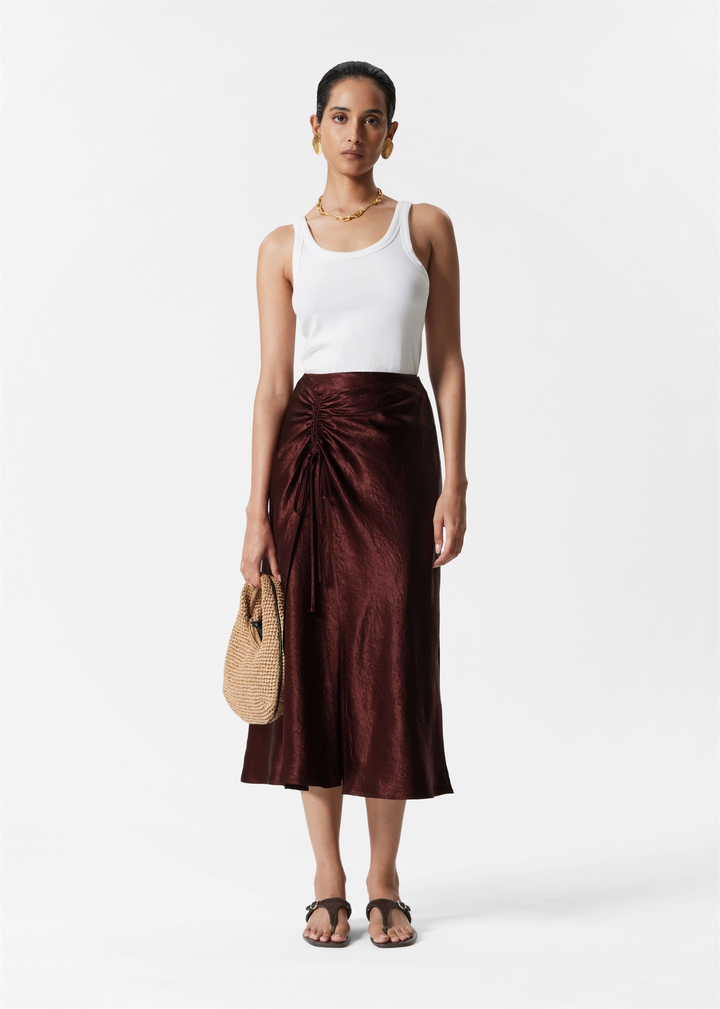 Эта юбка-слип изготовлена из блестящей атласной ткани с ворсистой текстурой, придающей ей современный тактильный вид. Юбка облегающего силуэта с высокой талией и облегающим дизайном, переходящим в тонкий разрез спереди. Модель дополнена регулируемым шнурком, создающим мягкие рюши, которые придают ей подвижность и объем. Застегивается на потайную молнию в боковом шве. Длина юбки: 84,5 см / 33,3" (EU 36 / UK 8 / US 4)