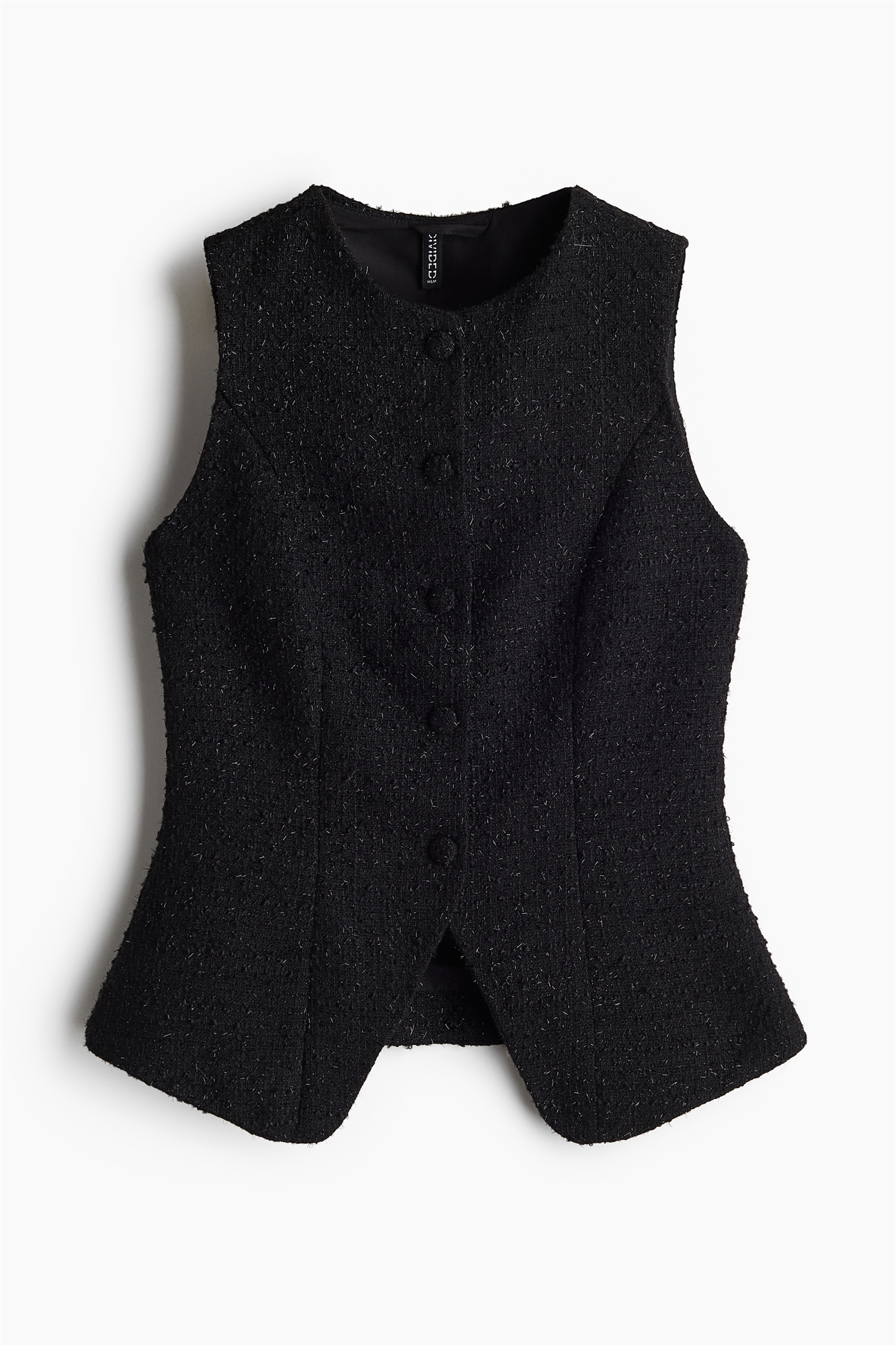 Приталенный жилет из фактурного переплетения с рельефными блестящими нитями. Круглый вырез, узкий разрез в верхней части и закрытые пуговицы спереди. Швы "принцесса" спереди и сзади для придания силуэту привлекательности. На подкладке.