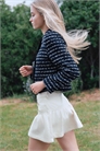 Короткая юбка из жесткого хлопкового денима с заниженной талией, застежкой на молнию и пуговицу. Спереди V-образный шов на бедрах. Передние карманы и расклешенный подол с пеплумом. Без подкладки.