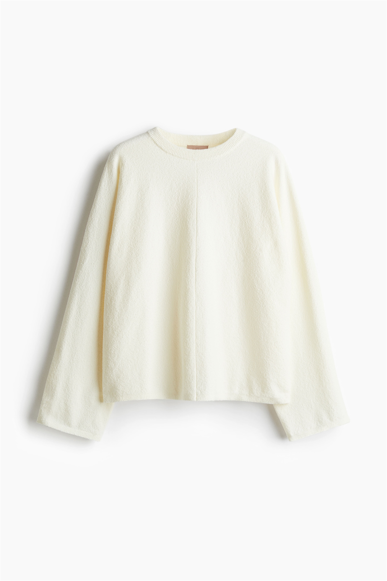 Джемпер свободного кроя из мягкого трикотажа букле с круглым вырезом, отделанным ребрами, длинными рукавами и видимым швом спереди и сзади.