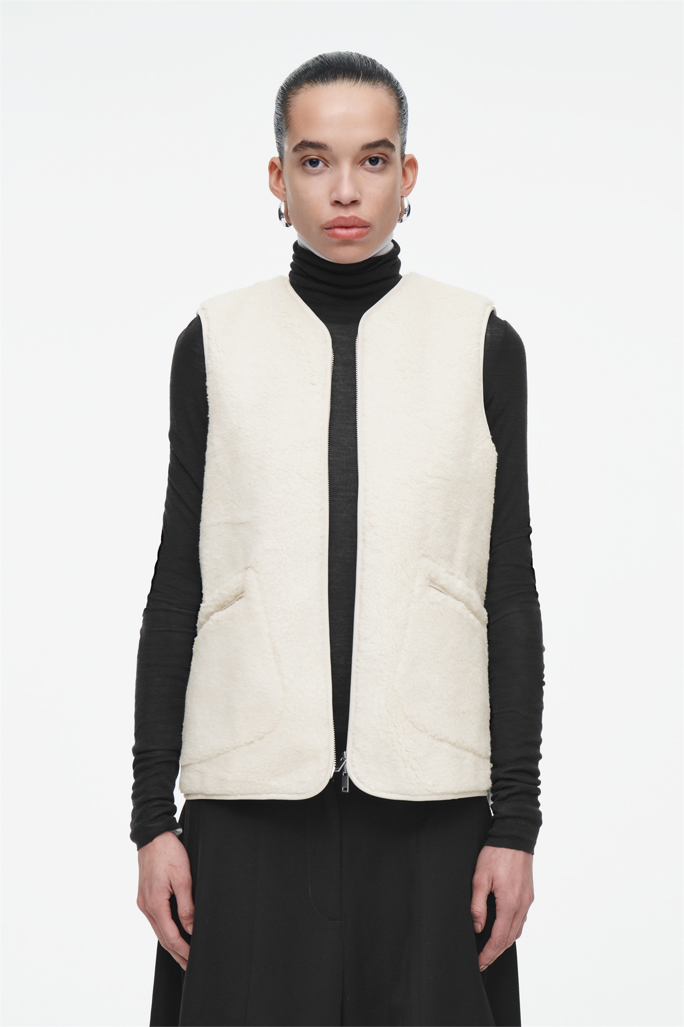 Эта жилетка из искусственной овчины - образец уюта и изысканности для осенне-зимнего сезона. Выполненная в мягком цвете слоновой кости, она имеет V-образный вырез и передние карманы, в которые можно положить руки. Модель выполнена в форме оверсайз и отделана гладкой подкладкой и тональным переплетом. Oversized fit Застежка-молния Лучшая альтернатива обычному полиэстеру, переработанный полиэстер изготавливается из отходов до и после переработки: 100% переработанный полиэстер. Без учета отделки / Сухая чистка Длина по спинке для размера S составляет 64,1 см / Модель носит размер S