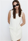 Короткое платье без рукавов из тканого материала с V-образным вырезом и потайными пуговицами спереди. Заниженная талия, декоративные карманы спереди, приталенный лиф и расклешенная юбка. На подкладке.