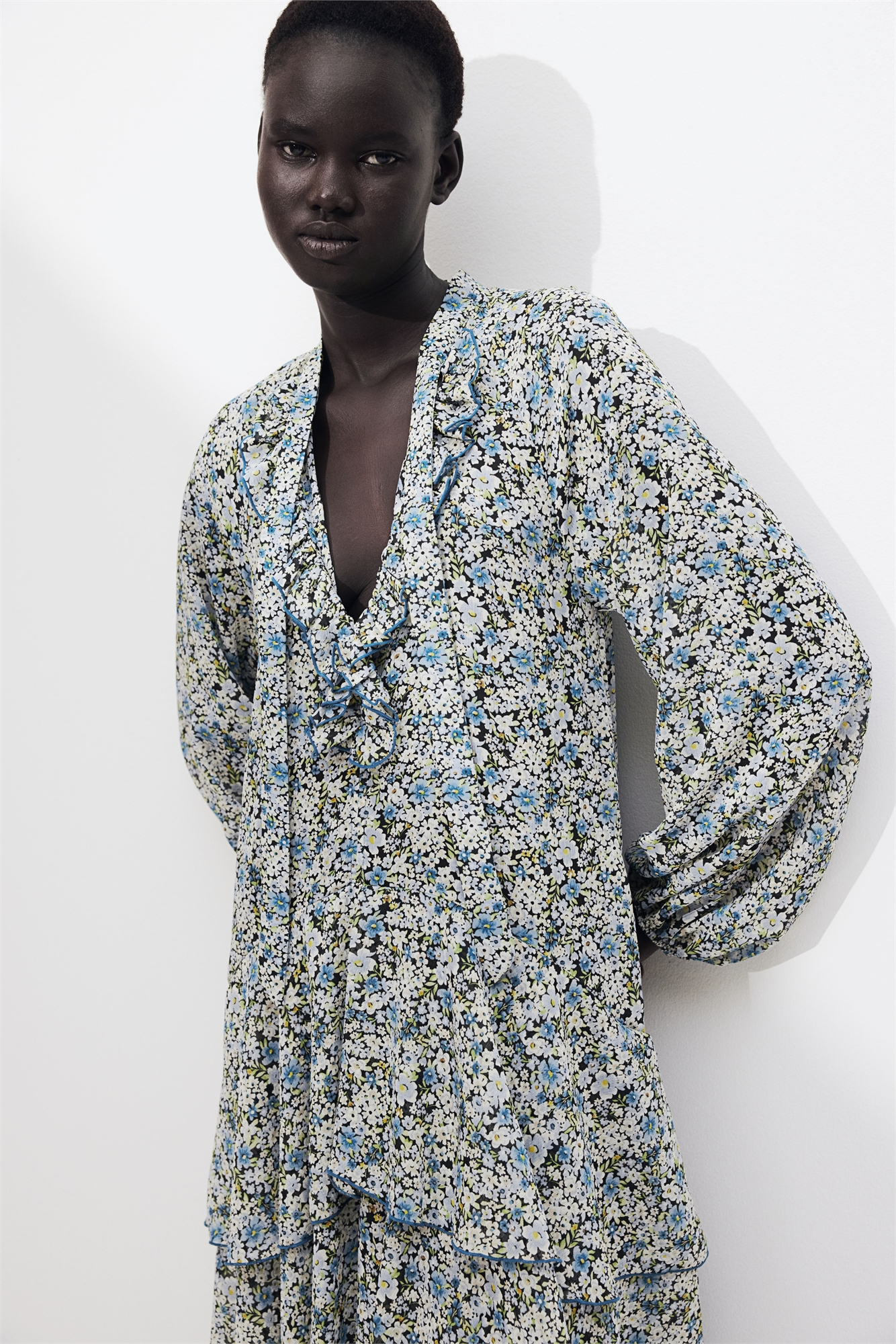Платье макси из креп-шифона с небольшим воротником-стойкой и завязками спереди. Глубокий V-образный вырез с оборками и длинные рукава реглан с эластичными манжетами. Юбка с воланами и оверлоком по краям придает дополнительный объем. Без подкладки.