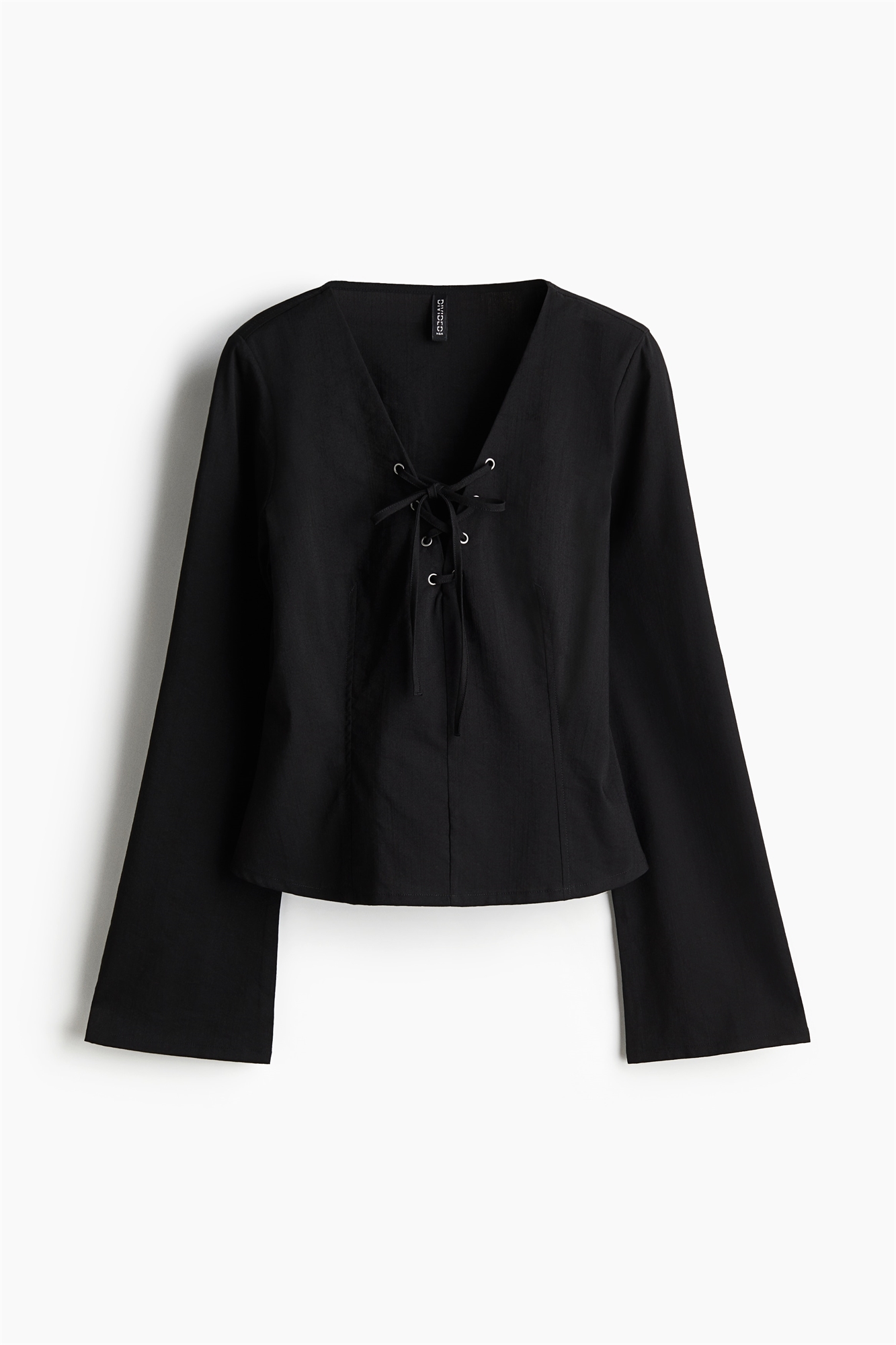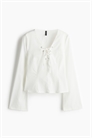 Облегающий топ из тканого материала с V-образным вырезом и шнуровкой спереди. Длинные рукава-трубы, заниженная талия и прямой подол.