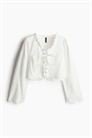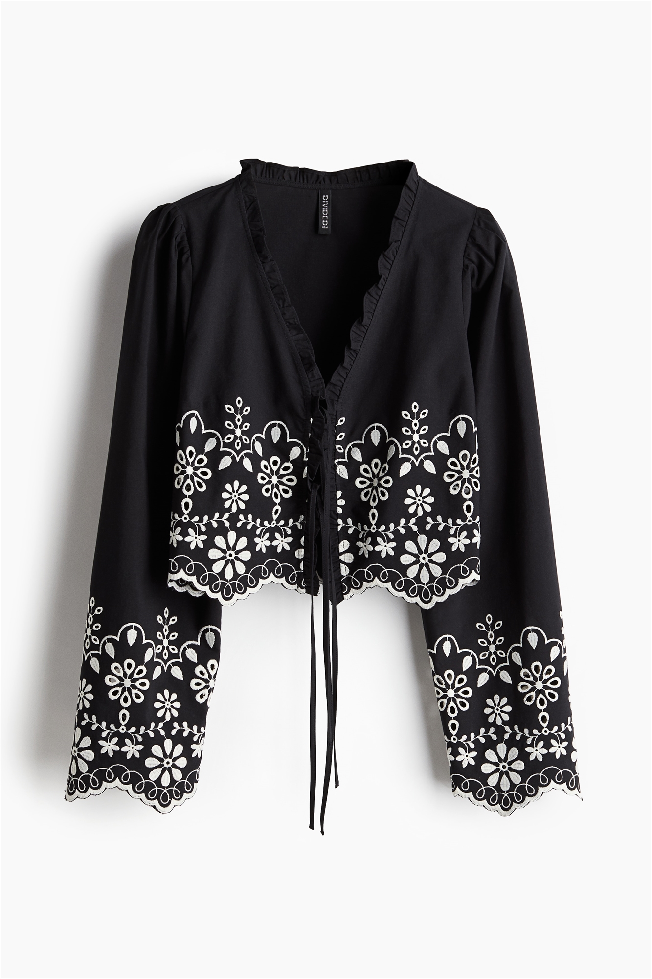Короткая, открытая блузка из воздушного хлопка с рисунком broderie anglaise. V-образный вырез с отделкой воланами и двумя парами узких завязок спереди. Длинные пышные рукава и обрезные края на манжетах и подоле.