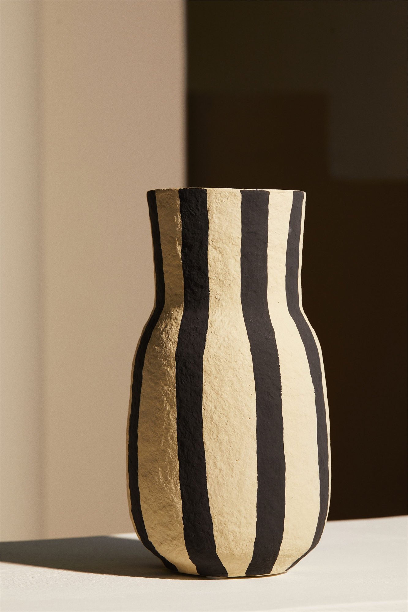 Большая ваза из папье-маше, изготовленная из волокон хлопковой целлюлозы, с полосатым узором и фактурной отделкой в деревенском стиле. Подходит для сухих цветов. Диаметр в самом широком месте 14 см. Высота 28 см.