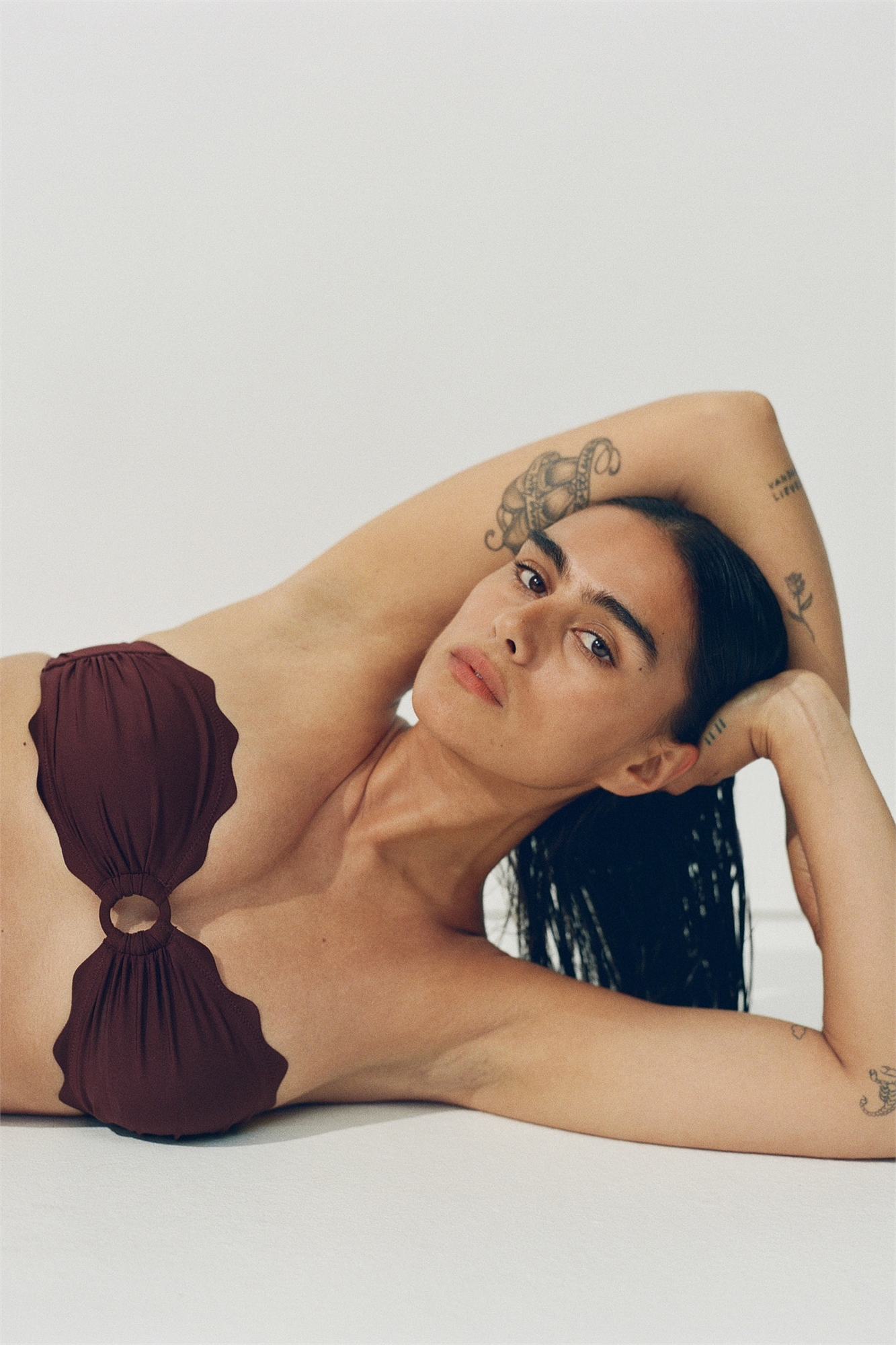 Бикини-бандо на подкладке с гребешковыми краями и чашечками со съемными вкладышами, которые формируют бюст и обеспечивают хорошую поддержку. Бонирование по бокам и закрытое кольцо в центре бюста. Без застежек.