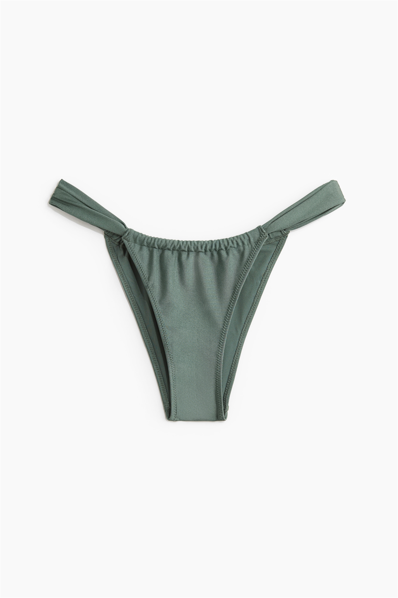 Трусики-бикини на подкладке, с заниженной талией, со сборками по бокам и вырезом сзади.