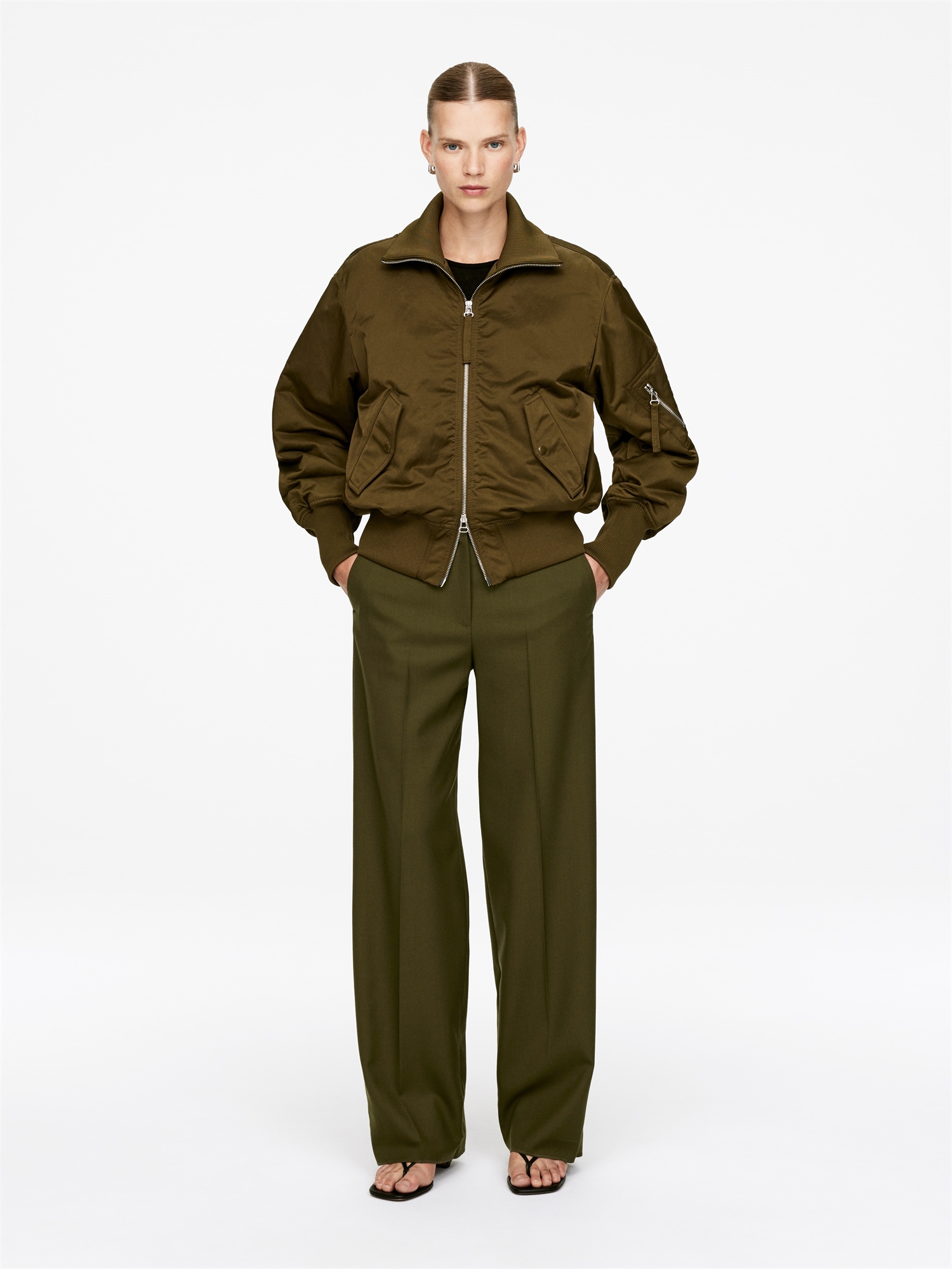 Брюки из шерсти хмелевого переплетения. Модель со средней талией, складками спереди и сзади, боковыми карманами и одним накладным карманом сзади. В состав ткани входит 100% шерсть RWS (TE-00047206). Продукция, сертифицированная по стандарту ответственной шерсти (RWS), содержит шерстяное волокно с ферм, прошедших независимую сертификацию на соответствие требованиям по благополучию животных и землепользованию.