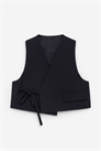 Укороченный жилет, изготовленный из шерсти хмелевого переплетения. Можно носить самостоятельно или поверх рубашки. Завязки и внутренняя застежка на пуговицах. Содержит 100% шерсти RWS (TE-00047206). Продукция, сертифицированная по стандарту ответственной шерсти (RWS), содержит шерстяное волокно с ферм, прошедших независимую сертификацию на соответствие требованиям по благополучию животных и землепользованию.