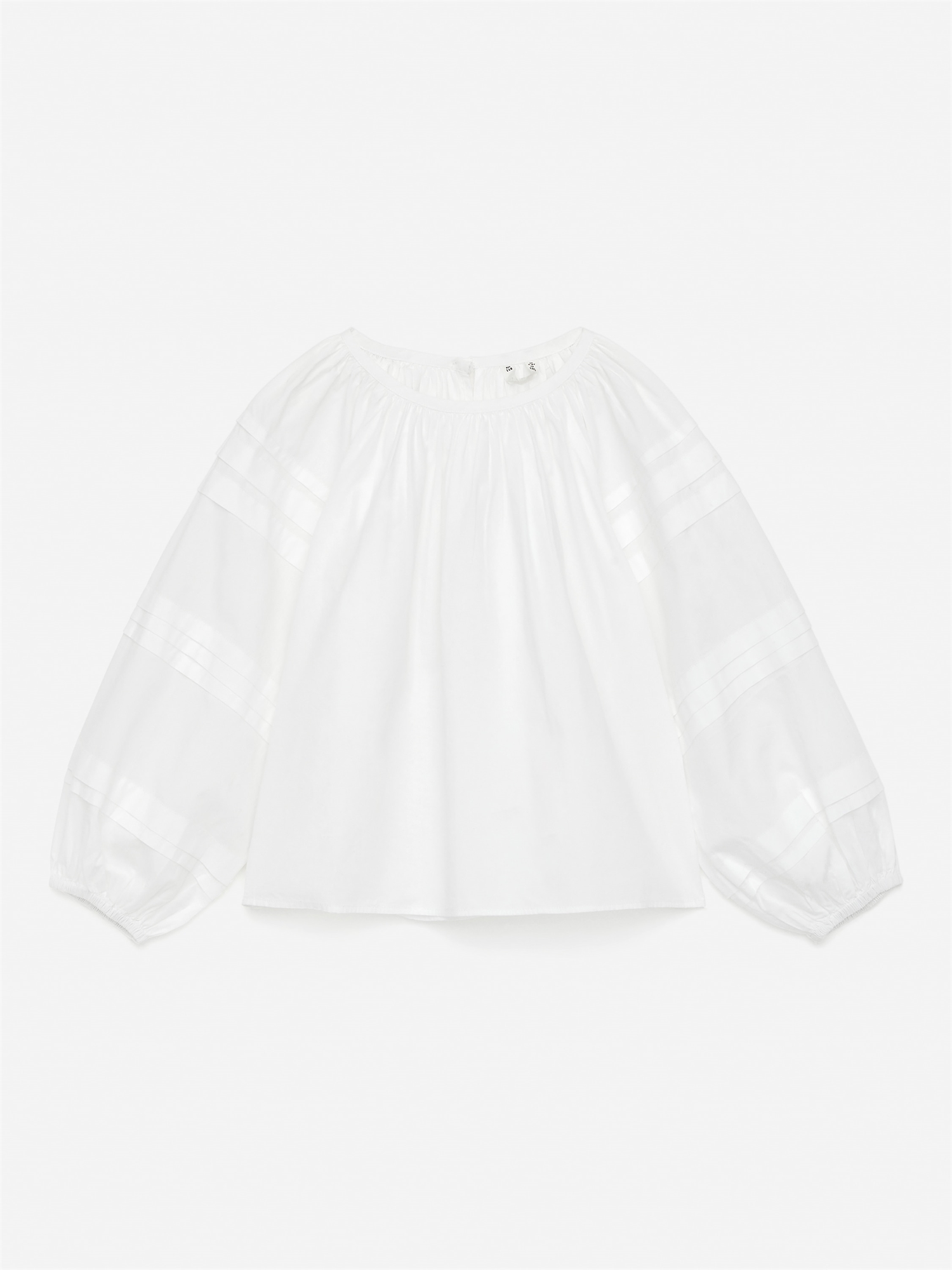 Блузка из хлопкового поплина с деталями в виде подтяжек на длинных рукавах. Закругленный вырез со сборками и отверстие для ключа с застежкой на пуговицу и петлю сзади. Эластик и сборки на концах рукавов.