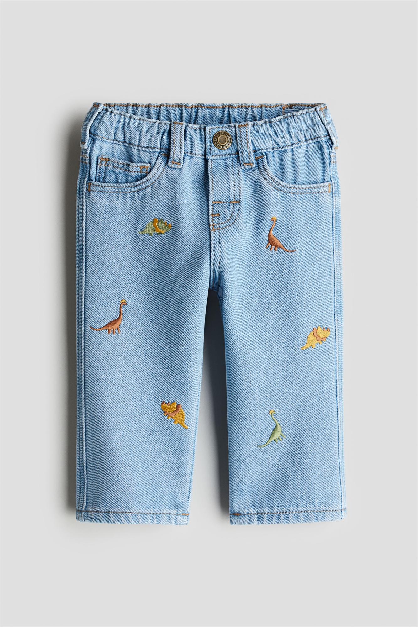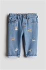 Джинсы из мягкого денима, украшенные вышитыми деталями спереди. Регулируемый, эластичный пояс с фальшивой ширинкой и кнопкой, декоративные передние карманы и открытые задние карманы.
