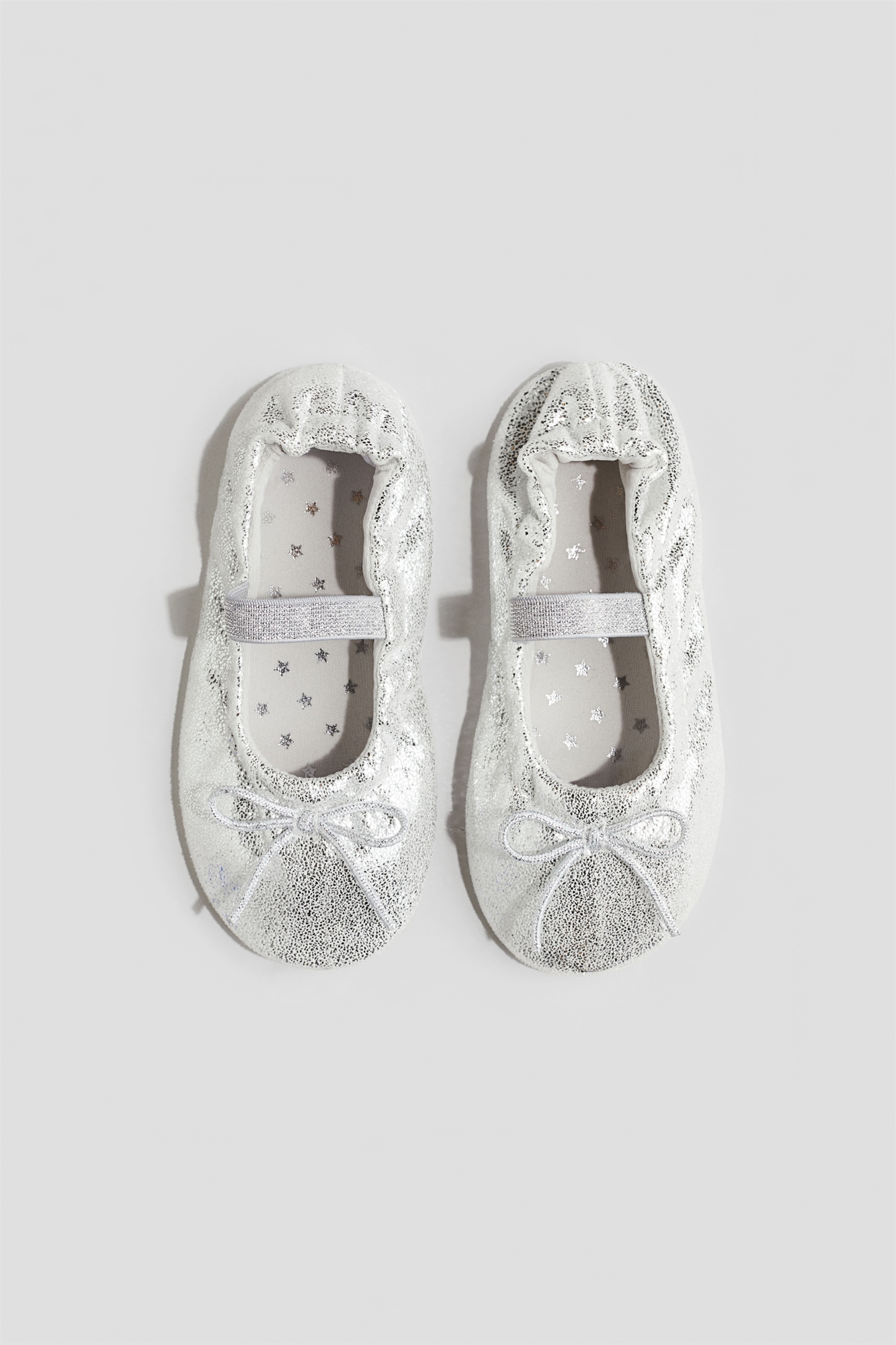 Мерцающие балетки с декоративным бантом спереди, блестящим эластичным ремешком по всей ноге и эластичным отверстием. Подкладка и набивная стелька из джерси, мягкая подошва. Только для использования в помещении.