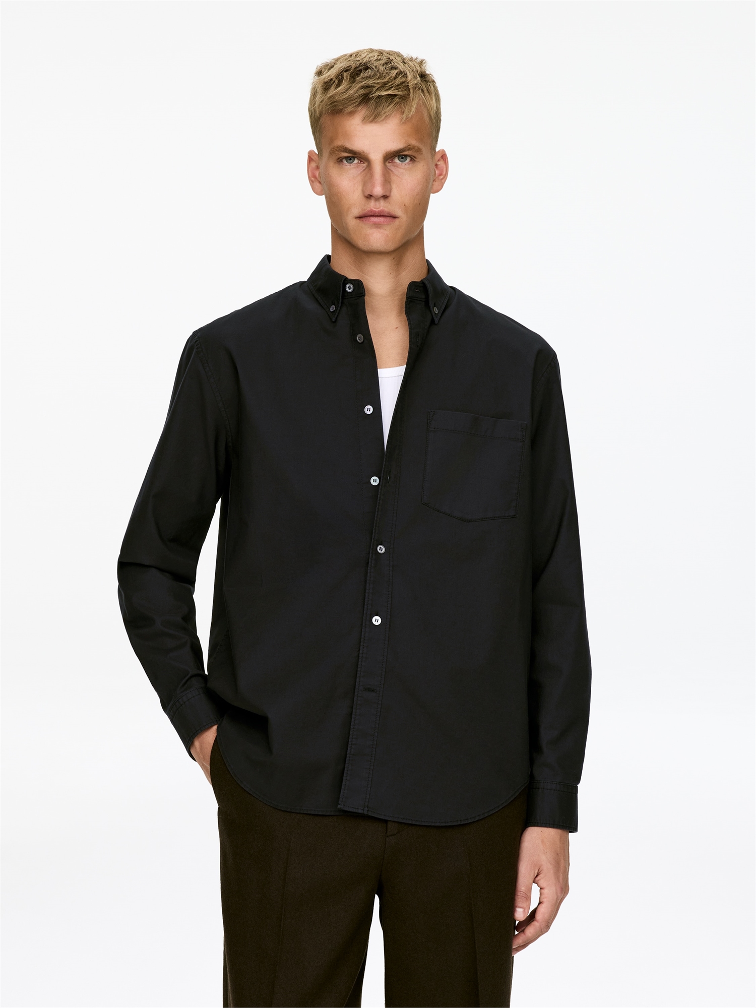 Окрашенная в цвет одежды рубашка сшита из хлопка оксфордского переплетения. Рубашка в непринужденном стиле с отложным воротником на пуговицах и одним нагрудным карманом. Манжеты на пуговицах. Изогнутая линия подола. Перламутровые пуговицы, что означает, что этот продукт содержит материал животного происхождения.