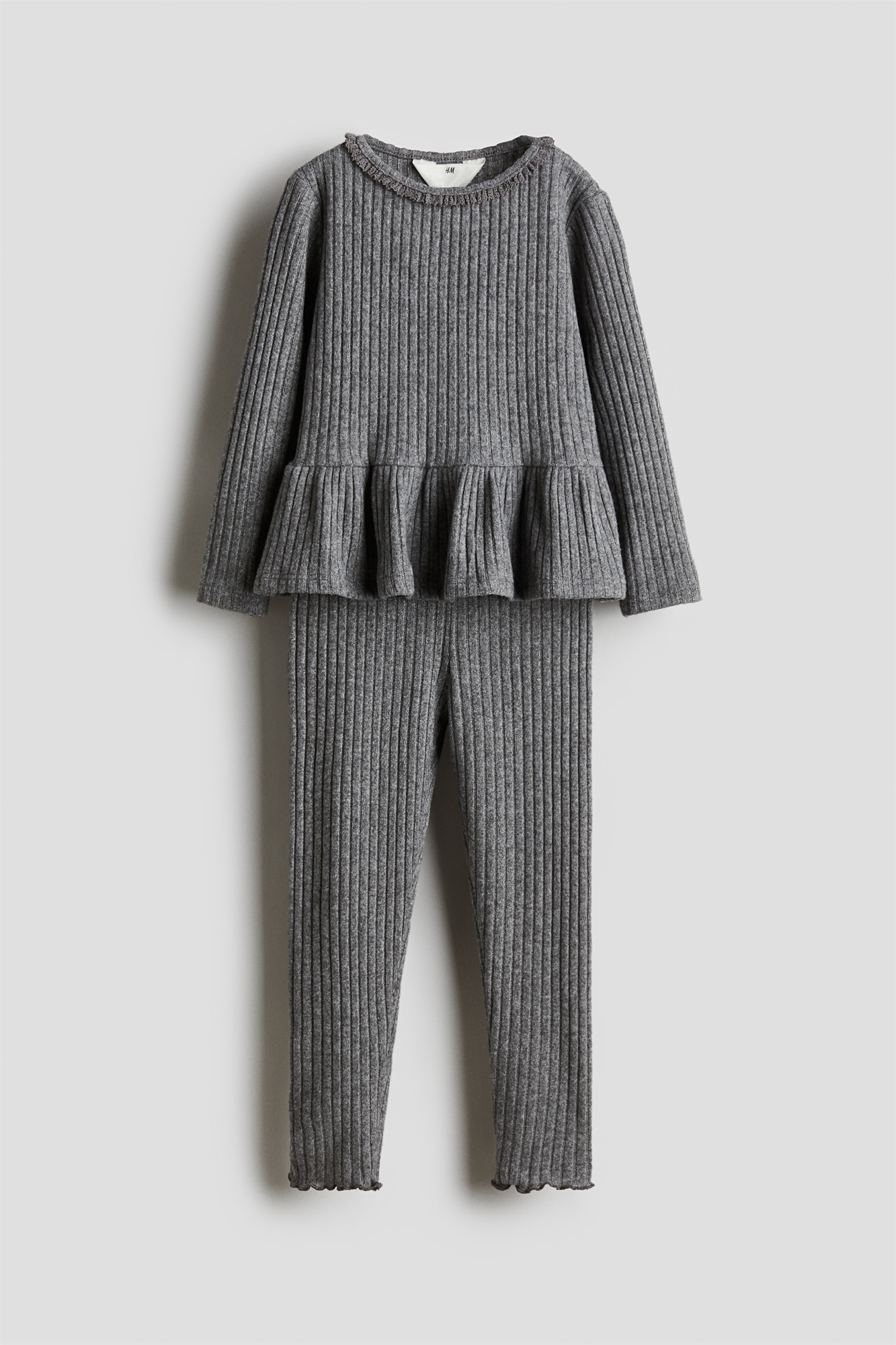Комплект из топа и леггинсов из мягкого трикотажа в рубчик. Топ с длинными рукавами, круглым вырезом с кружевной отделкой и расклешенным пеплумом. Леггинсы с эластичной талией и оверлоком по краям.