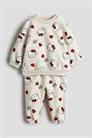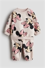 Комплект из топа и джоггеров из толстовки с мягкой ворсистой внутренней стороной и принтом по всей поверхности. Топ с круглым вырезом с ребристой отделкой и кнопками на одном плече (кроме размеров 2-4Y). Спущенные плечи, длинные рукава и окантовка манжет и подола. Джоггеры с утяжкой, декоративным шнурком на талии и утяжкой по подолу.