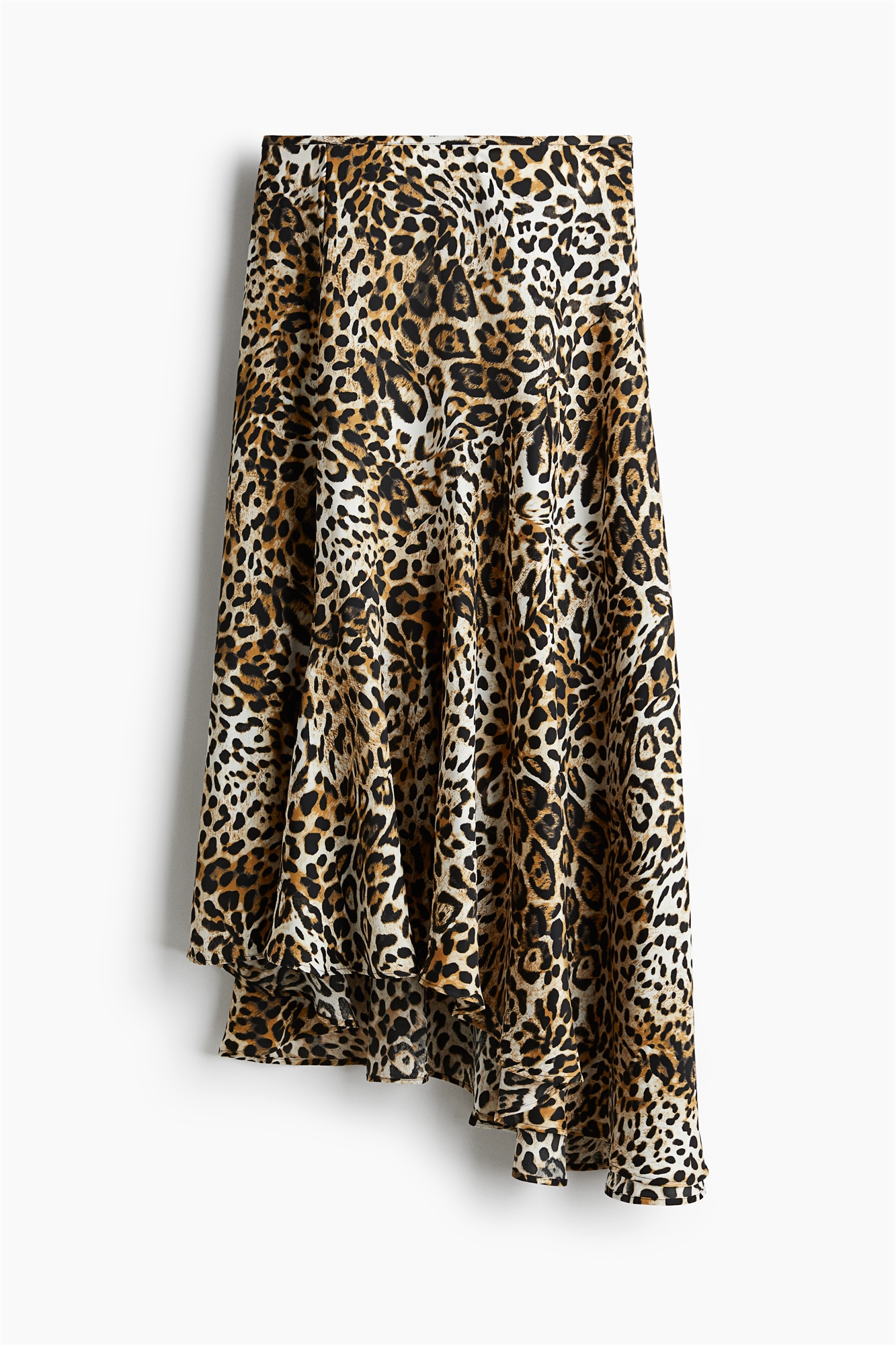 Расклешенная юбка длиной до колен из тканого материала с высокой талией и потайной застежкой на молнию с одной стороны. Диагональный шов от бедра вниз и асимметричный подол со вставками для придания объема. Без подкладки.