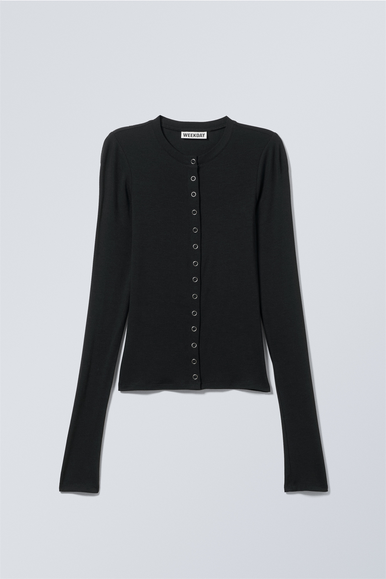 Однобортный кардиган с длинными рукавами и зауженным кроем. Круглый вырез и застежка на пуговицы.
