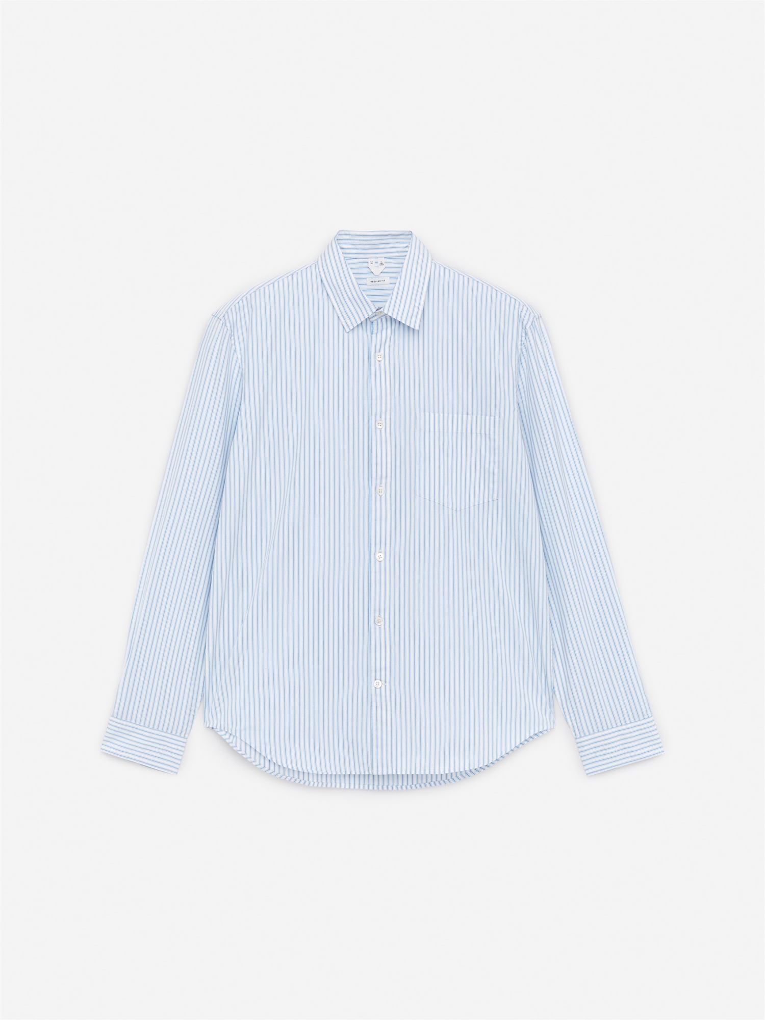 Рубашка с длинными рукавами из хлопкового поплина с узором из полос, окрашенных пряжей. Заостренный воротник и один нагрудный карман. Изогнутая линия подола. Обычный крой.
