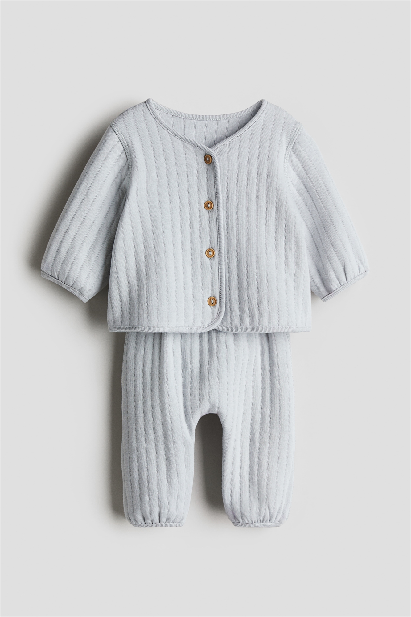 Комплект из топа и брюк из стеганого плотного джерси. Топ с пуговицами спереди, длинными рукавами и узкой ребристой отделкой вокруг проймы, на манжетах и подоле. Брюки с эластичным поясом и узкой ребристой отделкой по подолу.