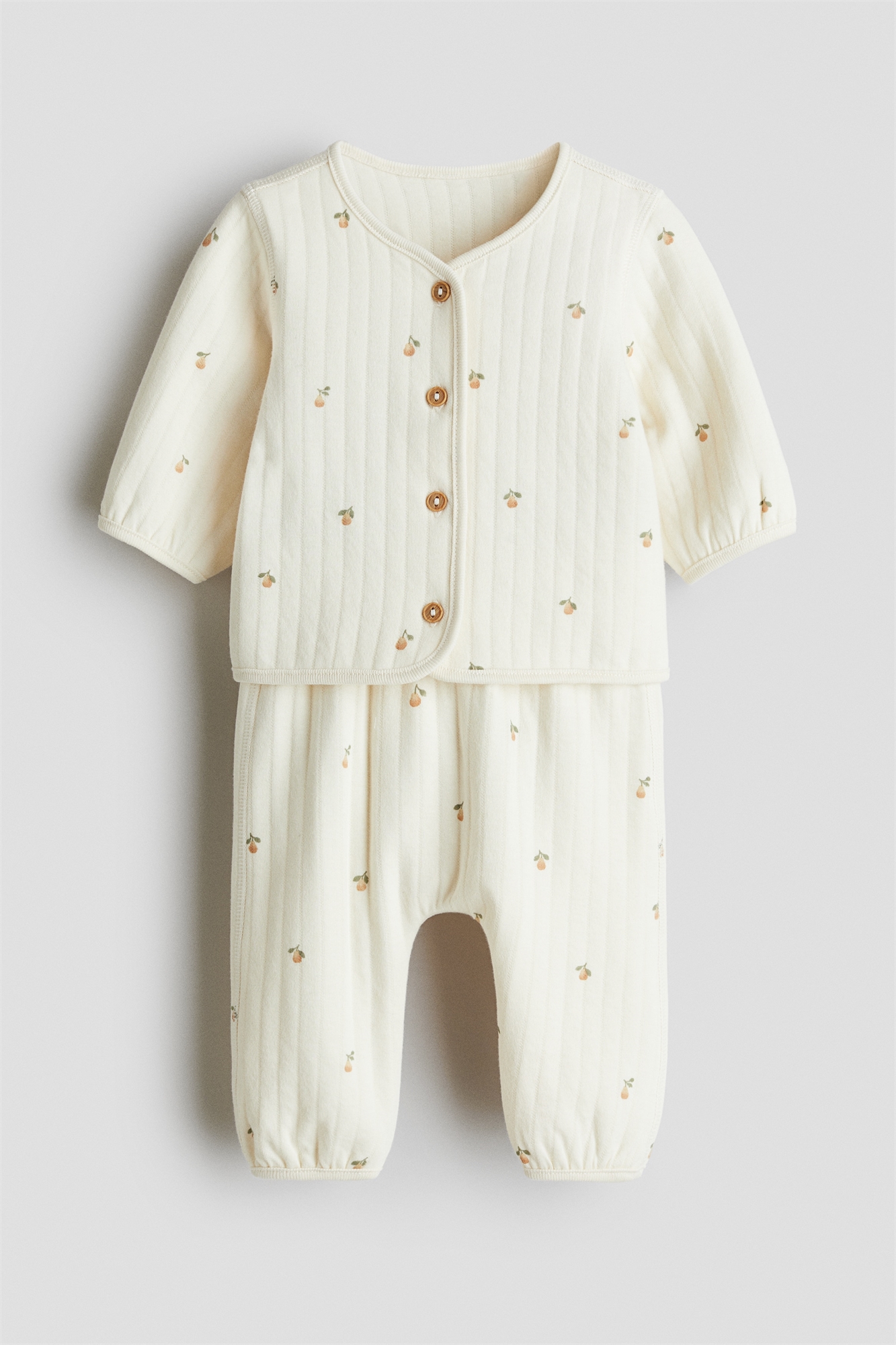 Комплект из топа и брюк из стеганого плотного джерси. Топ с пуговицами спереди, длинными рукавами и узкой ребристой отделкой вокруг проймы, на манжетах и подоле. Брюки с эластичным поясом и узкой ребристой отделкой по подолу.
