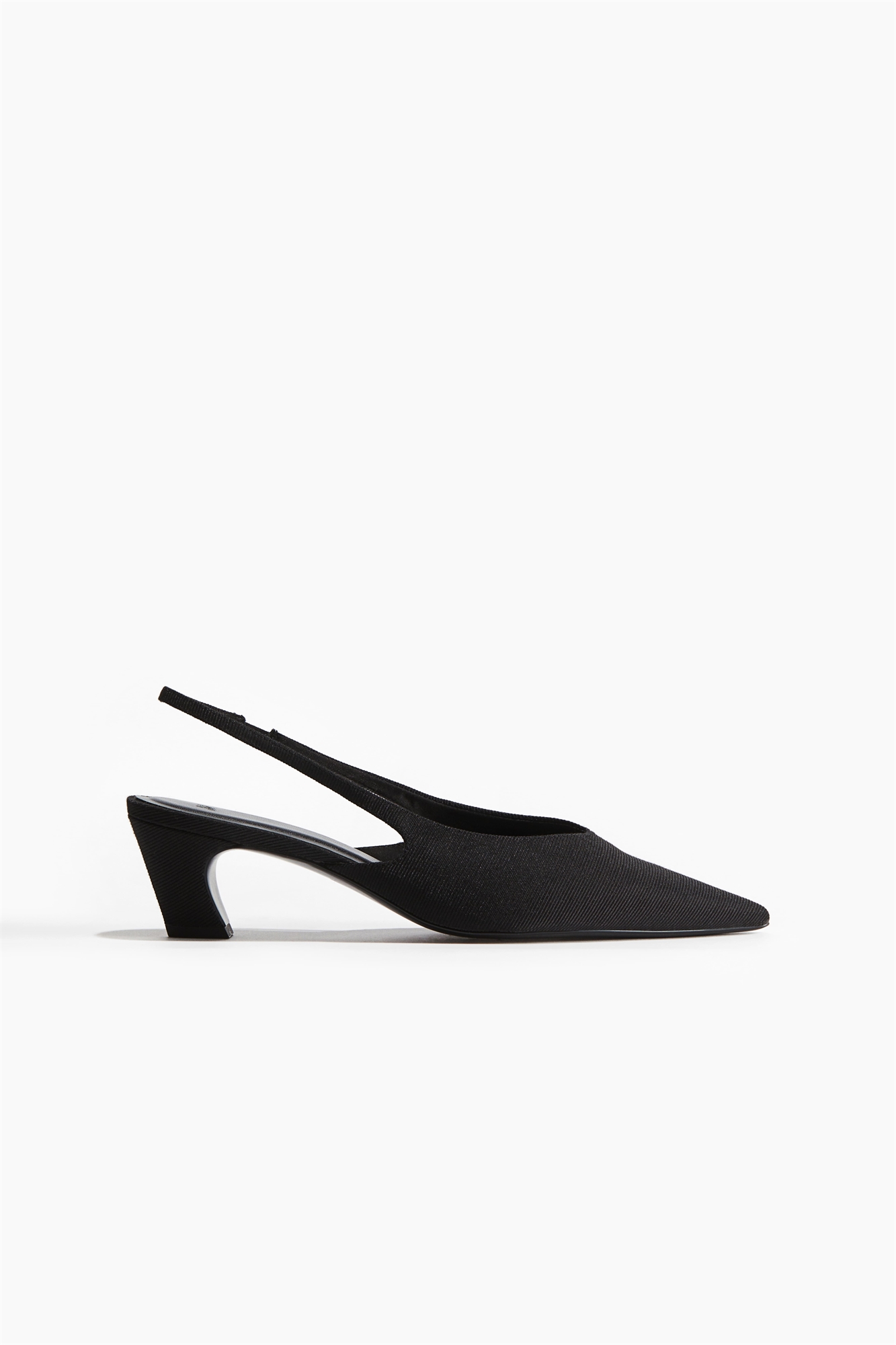 Туфли на шпильке из ребристой ткани с заостренным носком и узким эластичным ремешком на каблуке с одной стороны. Частично закрытый каблук. Атласная подкладка.