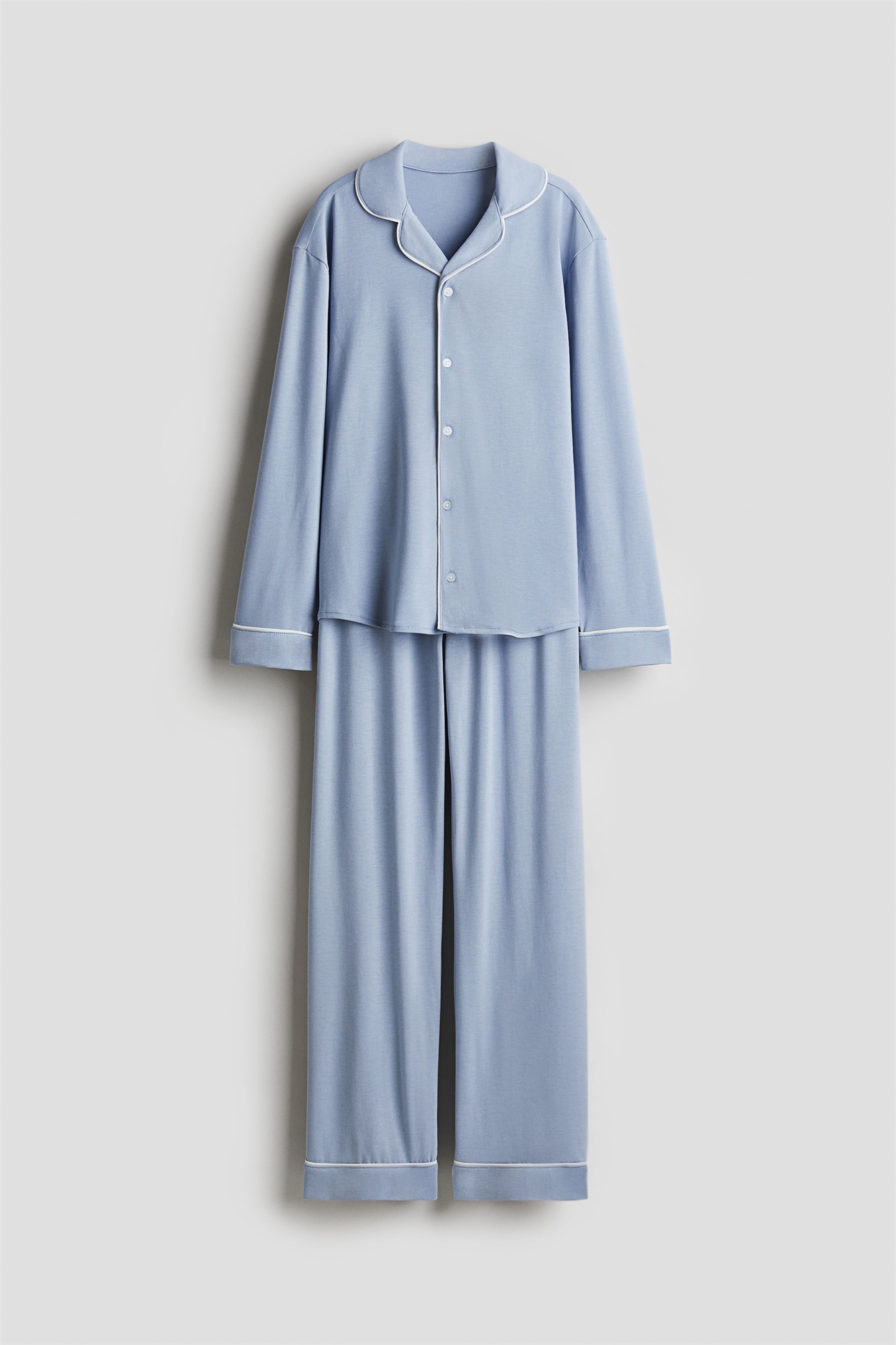 Пижама с рубашкой и низом из мягкого трикотажа. Рубашка с отложным воротником, пуговицами спереди и длинными рукавами. Нижние штанишки с эластичной резинкой на талии.