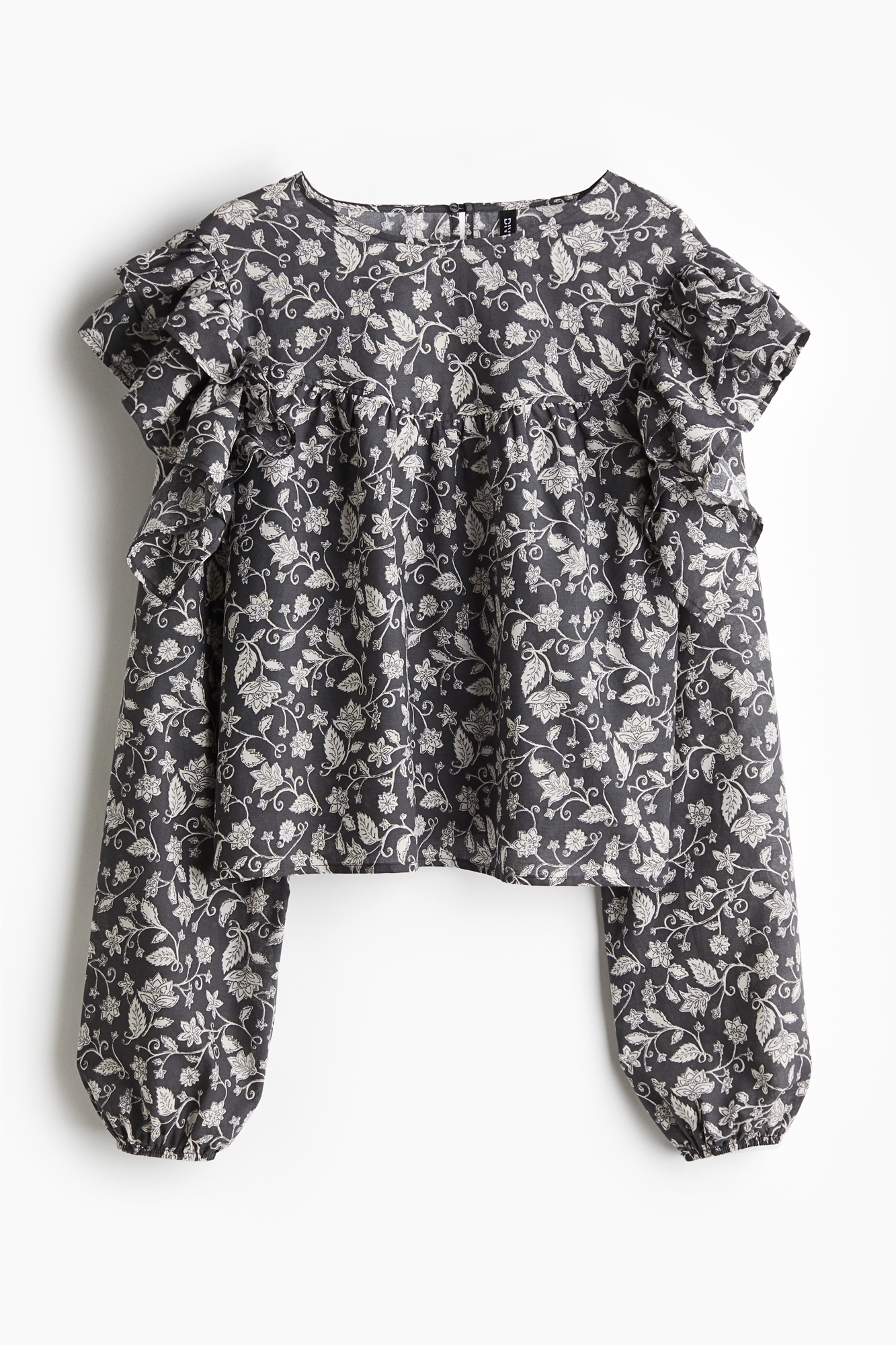 Блузка из хлопкового полотна с круглым вырезом и отверстием для ключа с пуговицей сзади на шее. V-образный ворот спереди и широкие оборки на плечах. Длинные рукава-баллоны с узкими эластичными манжетами и прямой подол.