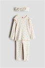Комплект из мягкого хлопкового джерси, состоящий из топа и леггинсов с отделкой оверлоком, а также подходящей по размеру повязки для волос. Топ с длинными рукавами, круглым вырезом, застежкой на пуговицу сзади и оборками на плечах. Леггинсы с регулируемой эластичной талией. Ободок для волос с бантом спереди и эластичной отделкой сзади.