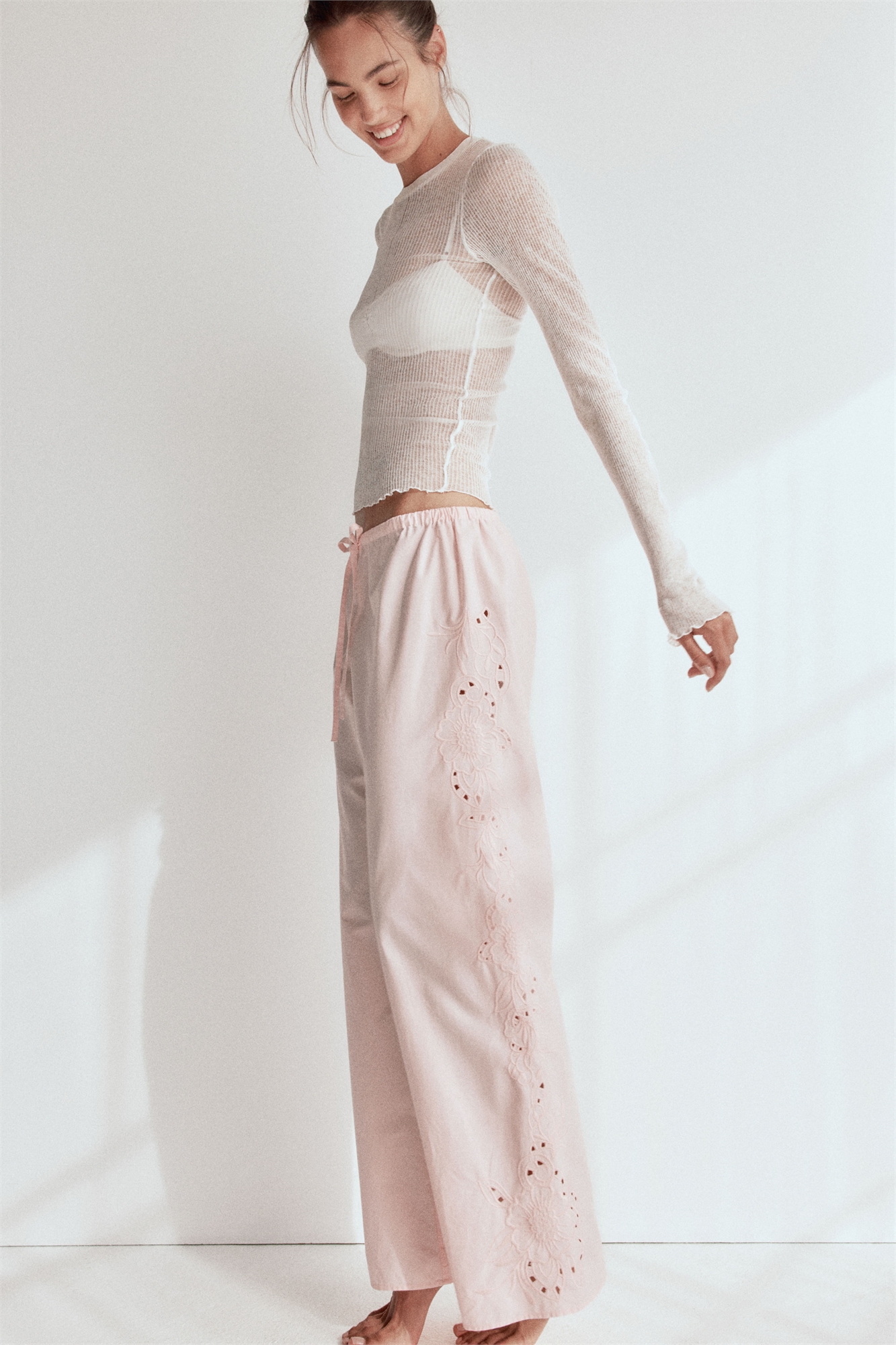 Свободные пижамные штанишки из воздушного хлопкового полотна с эластичным поясом и прямыми ногами с вышивкой по бокам.