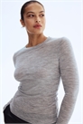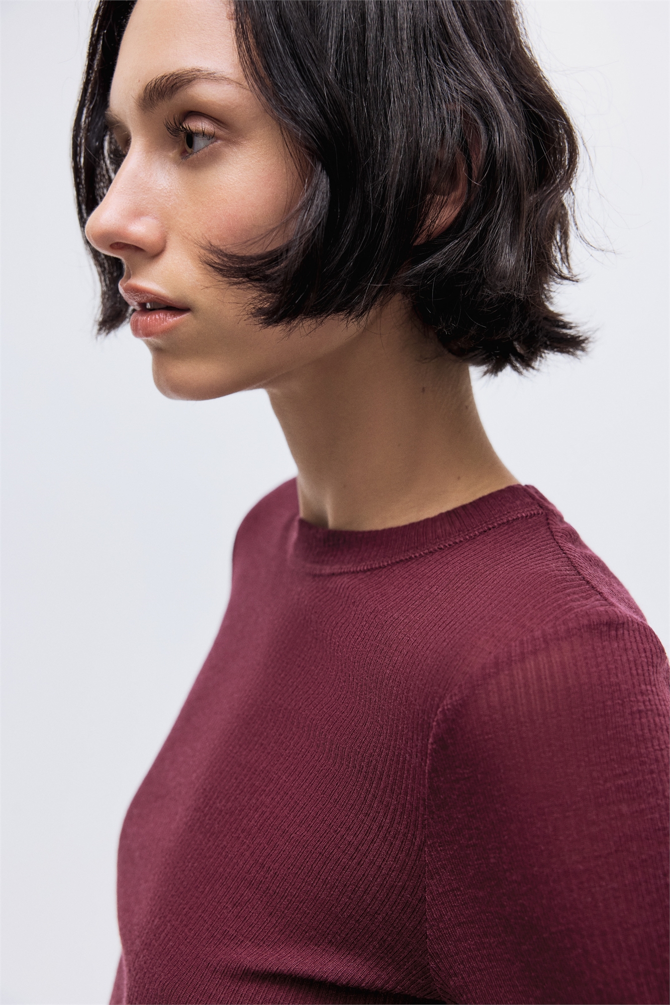 Облегающий топ из тонкой шерсти с ребристой вязкой и швами "флэтлок" против натирания. Круглый вырез с ребристой отделкой и удлиненные рукава.