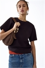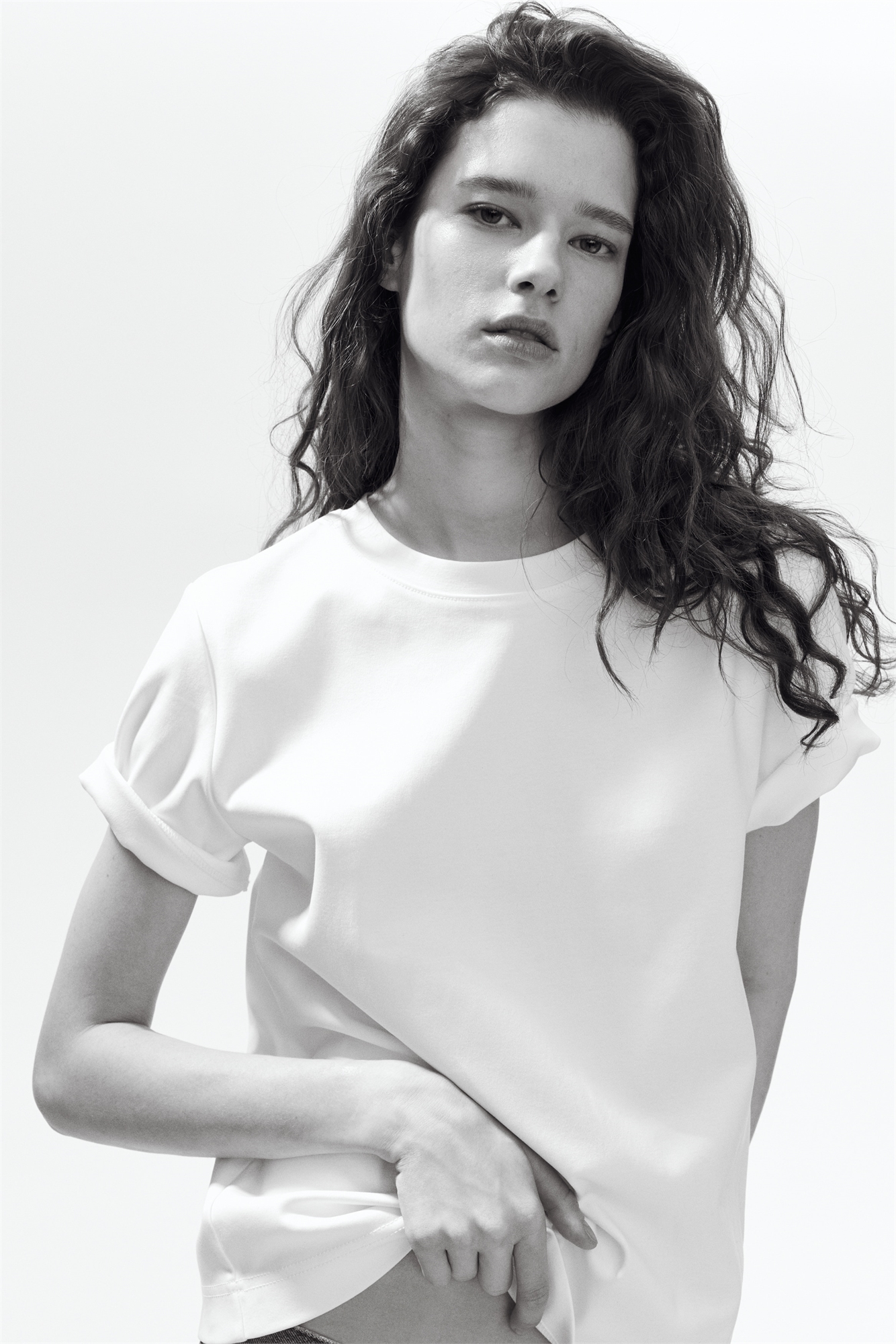 Свободная футболка из плотного хлопкового джерси пима с горловиной, спущенными плечами и рукавами, заканчивающимися чуть выше локтей.