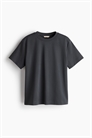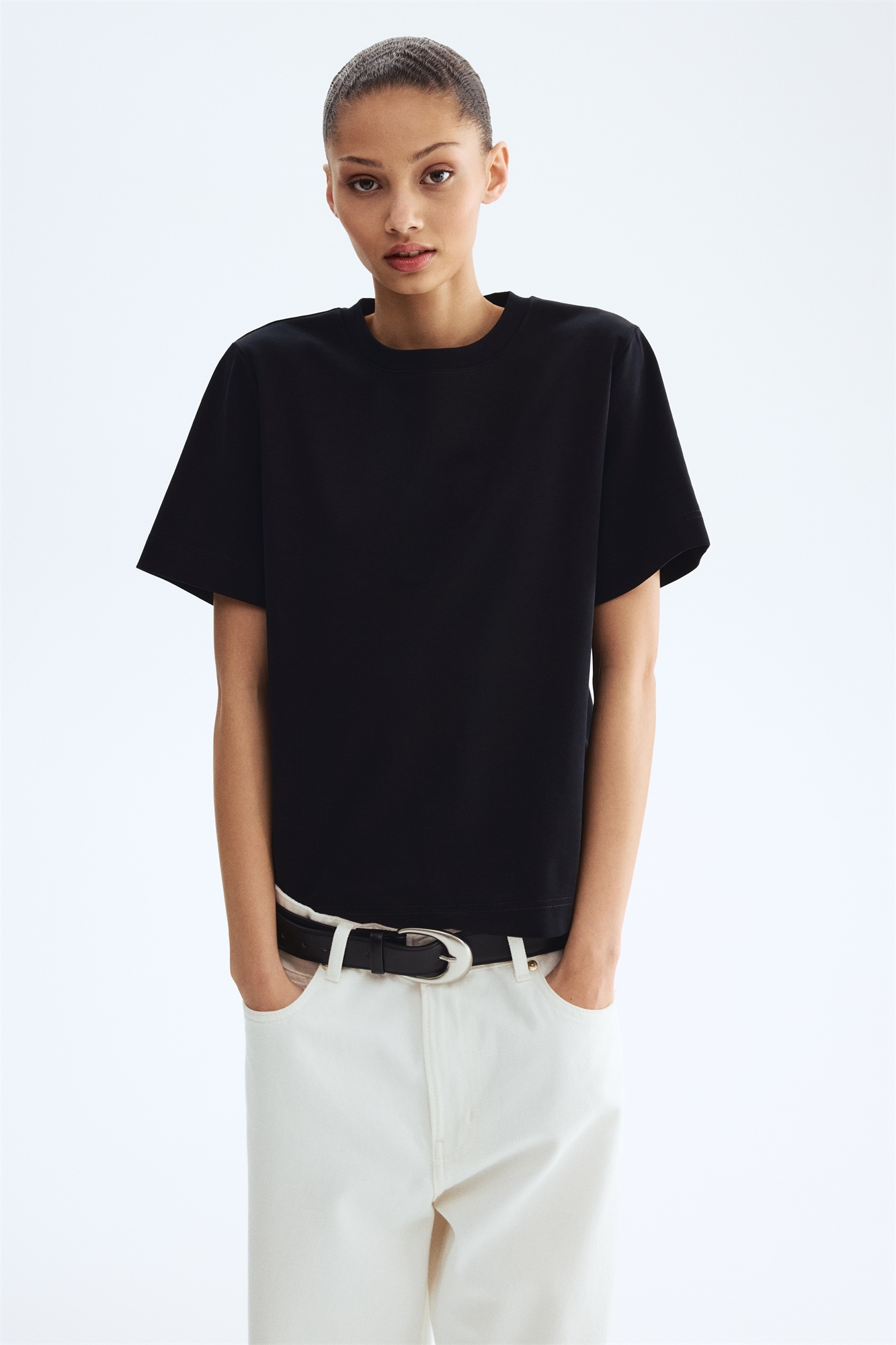 Свободная футболка из плотного хлопкового джерси пима с горловиной, спущенными плечами и рукавами, заканчивающимися чуть выше локтей.