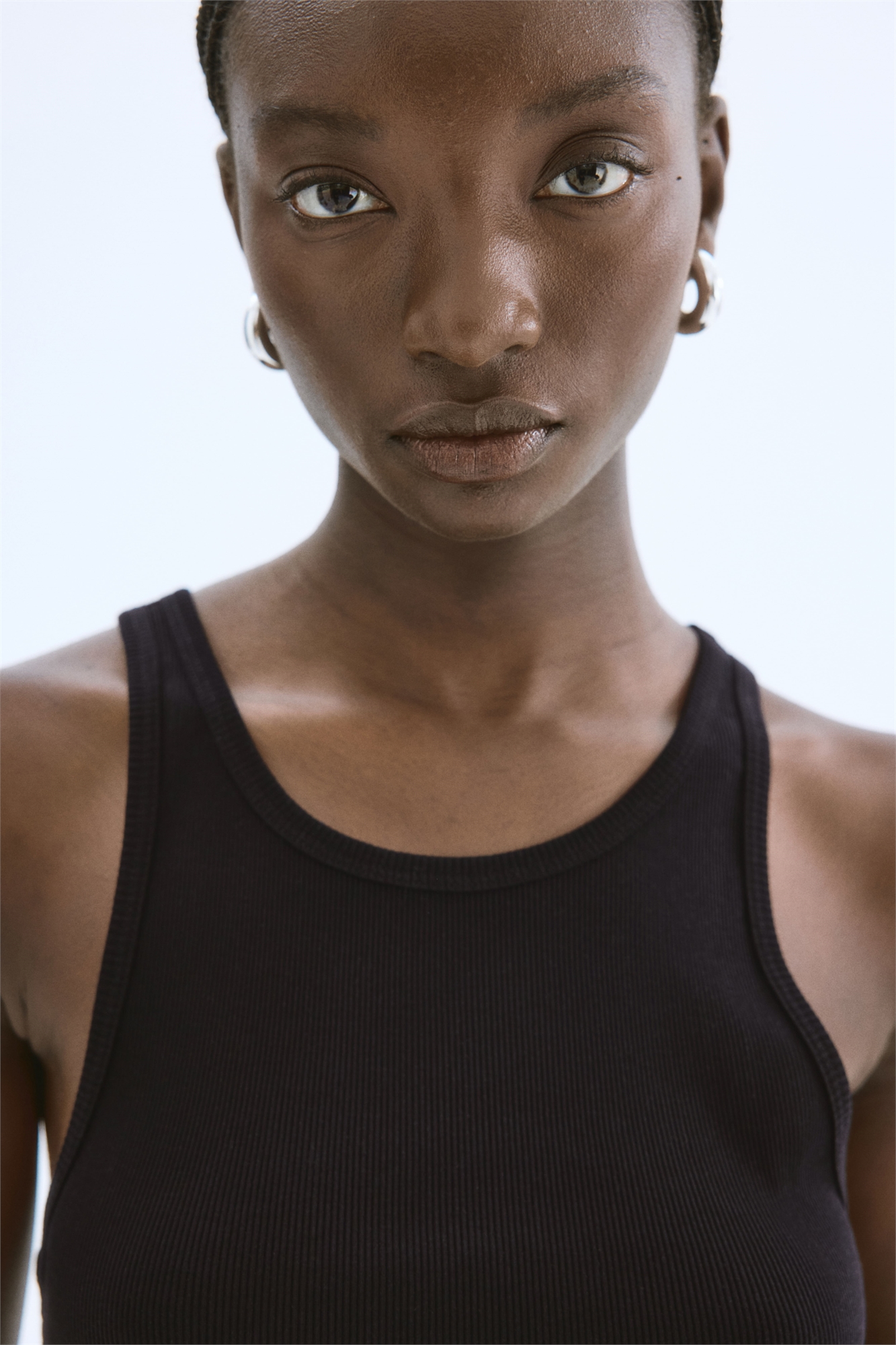 Облегающая майка из ребристого джерси, выполненного из смеси шелка и хлопка. Круглый вырез, узкая окантовка по вырезу и проймам.
