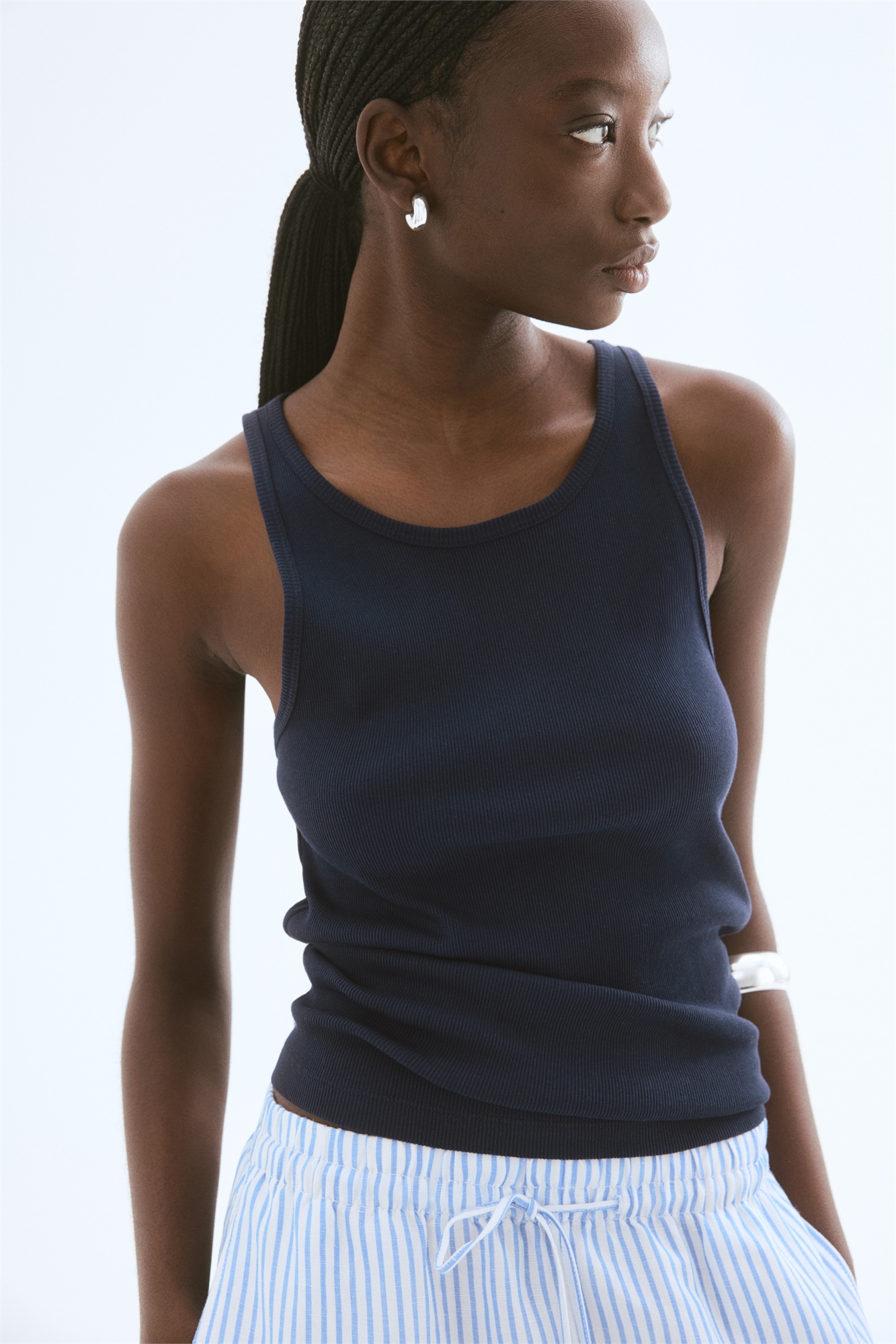 Облегающая майка из ребристого джерси, выполненного из смеси шелка и хлопка. Круглый вырез, узкая окантовка по вырезу и проймам.