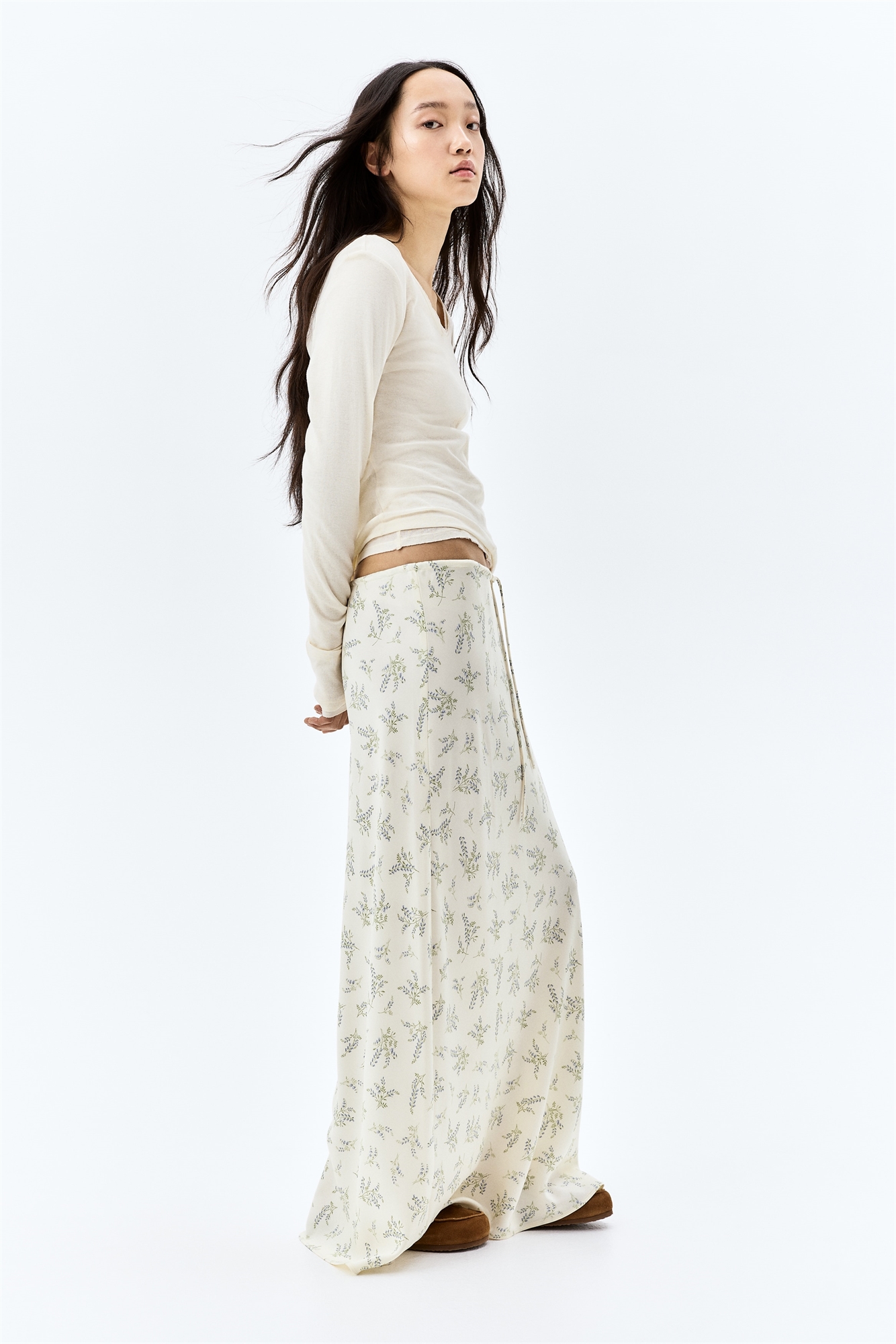 Длинная, слегка А-линия юбка из мягко драпирующегося атласа с эластичной отделкой и завязкой-спагетти на талии. Без подкладки.